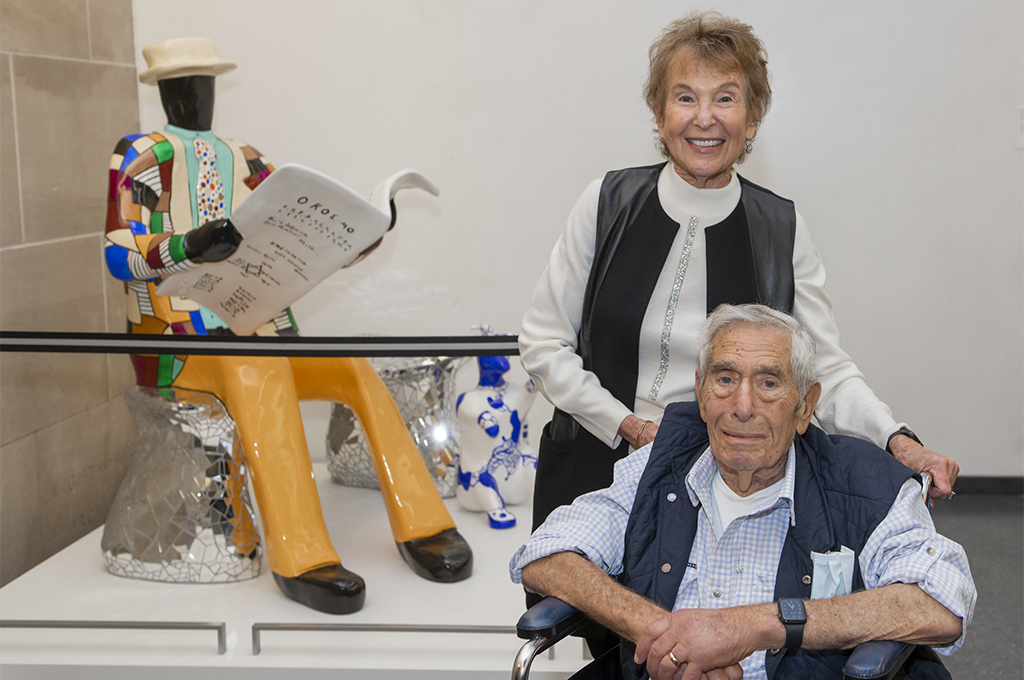 Mr. Baum’s generosity included the gift of two sculptures to the museum in honor of Ann. He was present just last month for a Society of Fellows and Business Council reception, when the group celebrated his gift of a whimsical sculpture, The Bench, 1989, by artists Niki de Saint Phalle and Marina Karella. The sculpture is on view in Bloch Lobby. In the past, he also gifted the museum with the Yinka Shonibare sculpture Planets in My Head, Physics, 2010, on view in the Bloch Building.