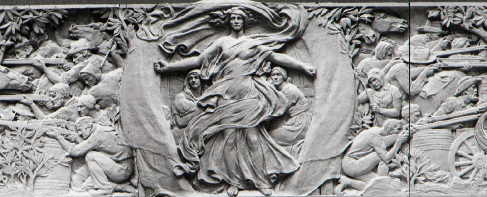 This is one of 23 panels designed by Charles Keck that wrap around the outside of the original Nelson-Atkins building. Together, they tell a story about the Midwest that today we might call a celebration of settler colonialism, or land occupation that results in the genocide and repression of Indigenous peoples and cultures. Keck himself described this image as, “A struggle between the Indians and white men for the right of possession. The central figure represents Fortitude protecting the pioneers.” He designed it 40 years after the U.S. Army massacred at least 150 Lakota people at the Battle of Wounded Knee and the myth of the total extinction of Native American peoples took root. Deeper interpretation of this and the other panels, guided by contemporary Native knowledge and experience, is part of the work ahead for the Nelson-Atkins.