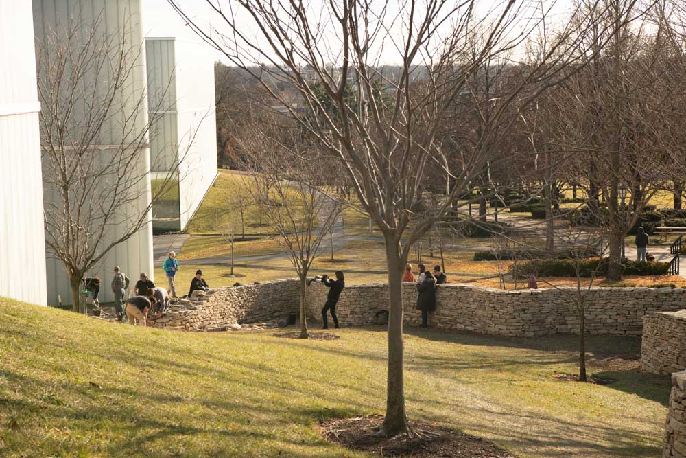 In March 2019, Walking Wall began a nine-month journey from the east side of the Nelson-Atkins campus to the threshold of the Bloch Building. An international team of dry stone wallers and assistants, led by Andy Goldsworthy, built the wall in five stages. In each stage, the wallers painstakingly dismantled the stonework from the rear of the structure and added it to the front, edging the wall forward. Visitors watched as the team broke down and moved the formidable wall, collaborating through all seasons and environmental conditions. In December, Walking Wall finished its journey, reforming the landscape of the museum, crossing the border between inside and out, and ultimately challenging the nature of walls themselves. Follow the journey here.