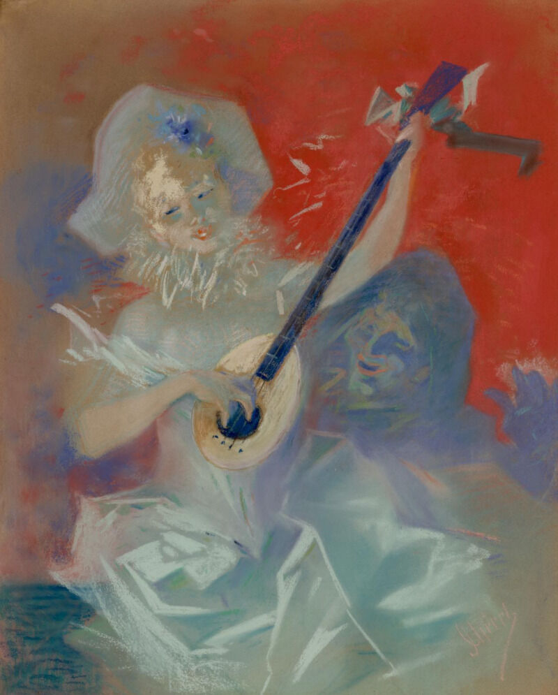 Jules Chéret, Woman Playing a Lute, ca. 1895, pastel on paper mounted to canvas, 24 1/4 × 20 inches (61.6 × 50.8 cm), Anonymous gift, 2024.30.12