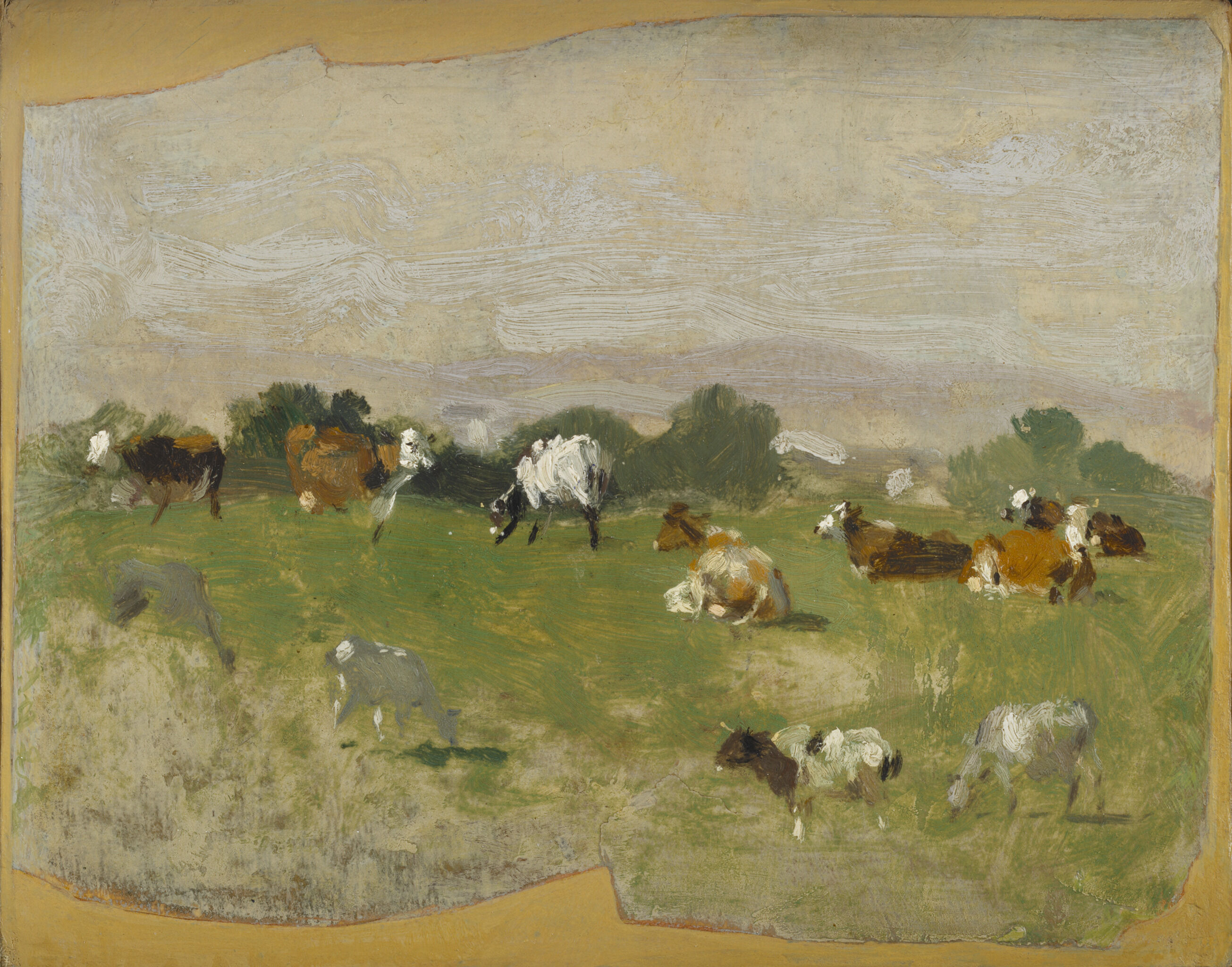 Eugène Boudin, Cows in Field, late 19th century, oil on paper mounted on canvas, 6 × 7 1/2 in. (15.2 × 19.1 cm), Purchase: William Rockhill Nelson Trust, D32-180