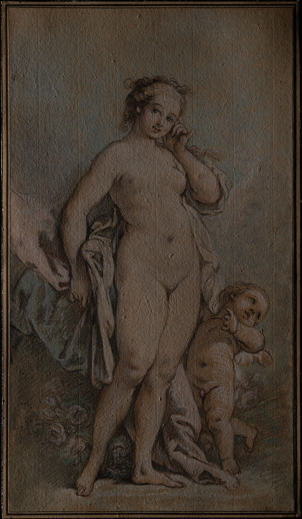 Venus with Cupid was a theme François Boucher and his workshop returned to often, and the pastel in the collection of the Nelson-Atkins Museum of Art is one of a cohort of drawings that presents Venus, recently disrobed and meeting the viewer’s gaze with a sidelong glance. She stands in contrappostocontrapposto: Italian for “counterpoise.” A term used in the visual arts to describe a figure standing with their weight on one straightened leg while the other leg is more relaxed. The posture shifts the hips and the shoulders in opposite axes. with one hand raised to her ear or cheek while the other holds back billows of drapery. Behind her is a rosebush, and at her side is an oversized Cupid. This entry offers a long-form description that focuses primarily on the paper supports, as these appear to have been assembled prior to media application and may provide insight into other drawings by Boucher.