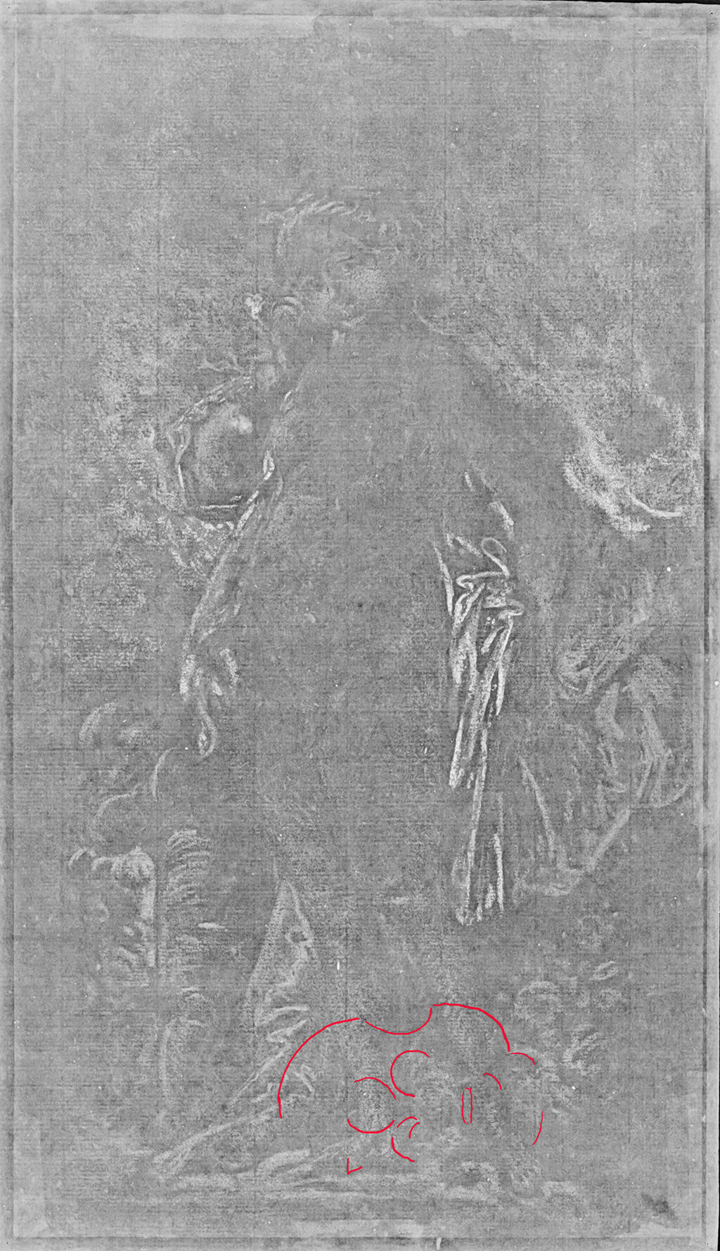 Fig. 7. Radiograph of Venus with Cupid (1750s). The partial watermark, a shield with a fleur-de-lis at the center, is annotated for visibility and appears along the lower edge. The image is reversed as the sharpest capture was attained by placing the digital cassette against the back of the artwork.
