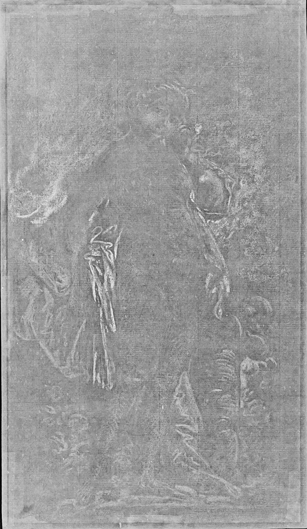 For the most part, Boucher used pointed pastel sticks for media application; however, he employed the broadside of a blue pastel to tone the background. The pastel is applied so that it does not completely obliterate the color of the paper, which the artist utilized as a mid-tone and to emphasize Venus’s fair skin and hair. Two reds are present: the most common is a warm color and was frequently used in shading. The other red is cooler and is blended with white in the drapery and highlights the blush in Venus’s cheeks, nipples, and labia majora. In radiographsX-ray radiography (also referred to as x-radiography or radiography): Radiography is an examination tool analogous to the use of X-rays in medicine whereby denser components of a painted composition can be recorded as an inverted shadow image cast on film or a digital X-ray imaging plate from a source such as an X-ray tube. The method has been used for more than a century and is most effective with dense pigments incorporating metallic elements such as lead or zinc. It can reveal artist changes, underlying compositions, and information concerning the artwork’s construction and condition. The resulting image is called an x-radiograph or radiograph. It differs from the uses of X-ray spectrometry in being dependent on the density of the paint to absorb X-rays before they reach the film or image plate and being non-specific as to which elements are responsible for the resulting shadow image. taken to identify watermarks, even lightly applied white media is readable as white, radio-opaque masses (Fig. 9).6See x-radiograph digital capture, no. 575.3, NAMA conservation file, 66-16. The digital x-radiograph was captured in 2022 under the following conditions: 10 kV, 5mAs, and 3.5 seconds. This indicates that a metal, likely white leadlead white: The most widely used white pigment from Roman times until well into the industrial period, it consists of cerussite and/or hydrocerussite, mineral names for neutral lead carbonate and basic lead carbonate, respectively. Plumbonacrite, another basic lead carbonate with proportionately less carbonate than hydrocerussite, can sometimes be found, as well. The whitest forms used in painting were historically produced by inducing lead metal to corrode in the presence of vinegar fumes., was a component of the pastel stick.