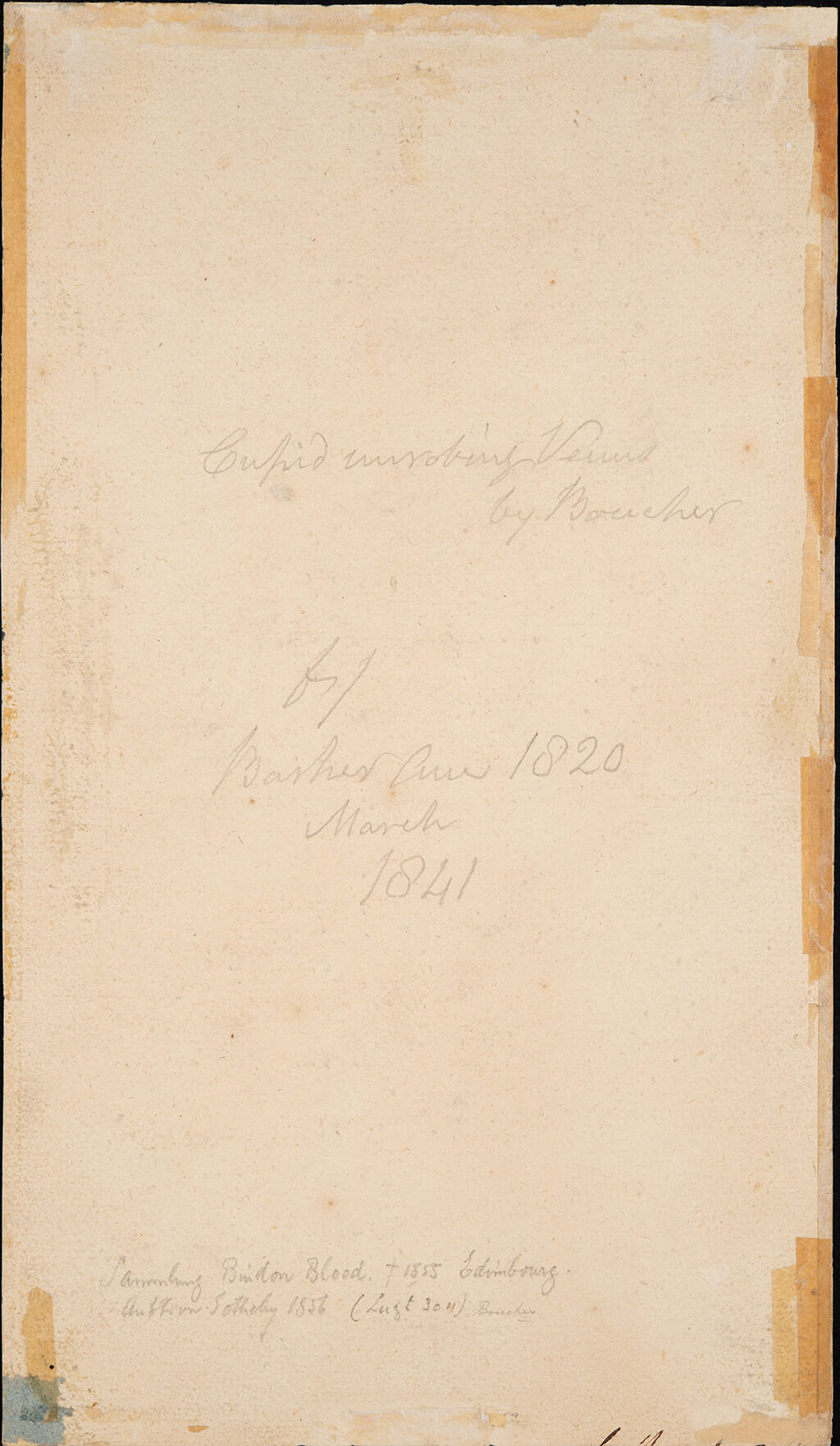 For further corroboration of Blood’s style of inscription and confirmation of Barker selling to Blood in March 1841, see email from Glynnis Napier Stevenson, NAMA, to Hugo Chapman, British Museum, London, February 16, 2022, NAMA curatorial files. See also Frits Lugt, Les Marques de Collections de Dessins et d’Estampes (Amsterdam: Vereenigde Drukkerijen, 1921), no. L.3011.