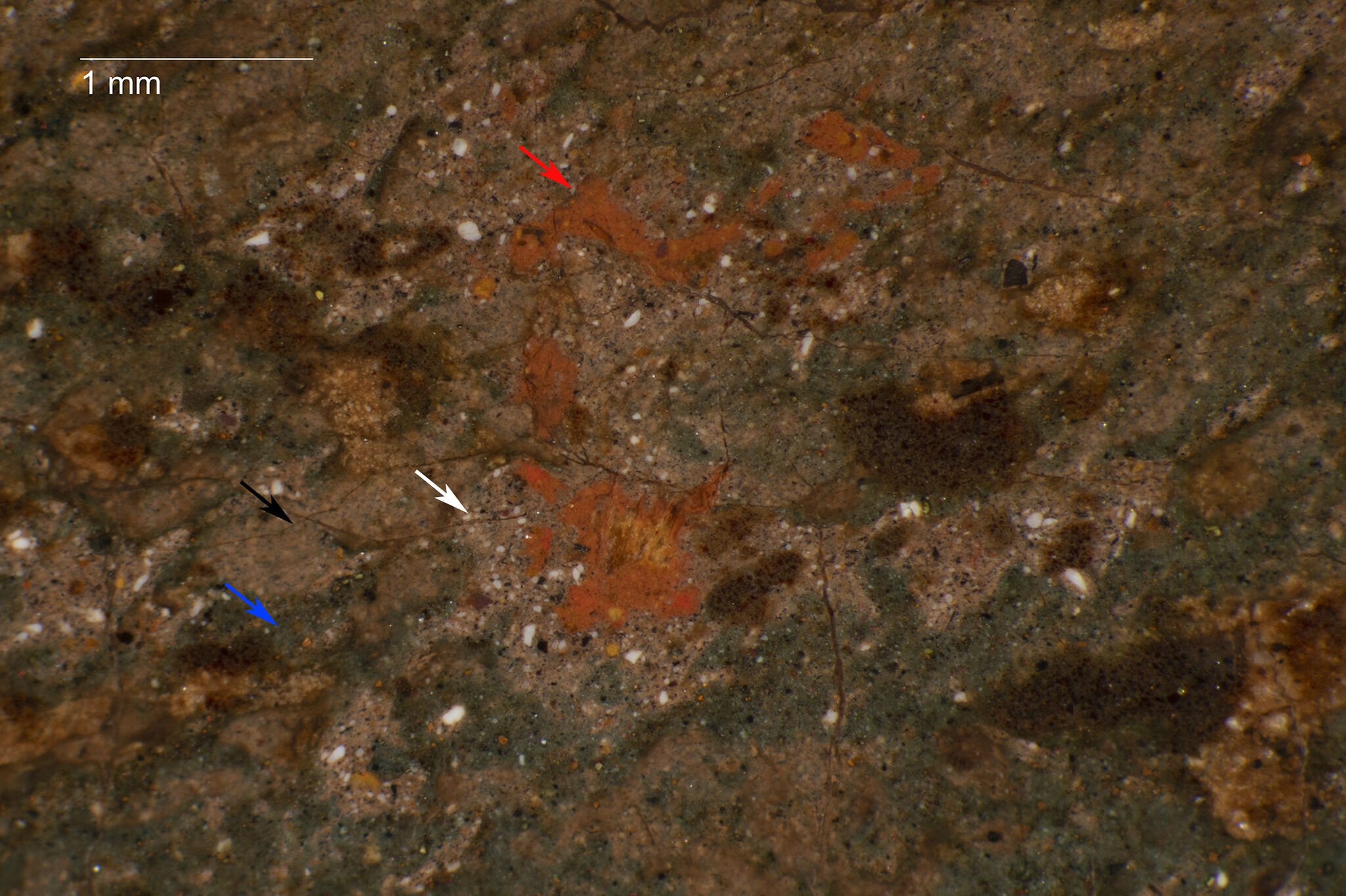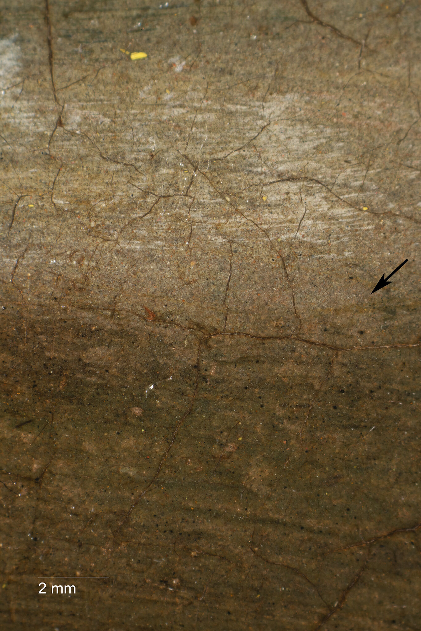 Fig. 5. Photomicrograph illustrating where the cool gray underpainting (top) ends at the ledge front (bottom), Still Life with Cat and Fish (1728)