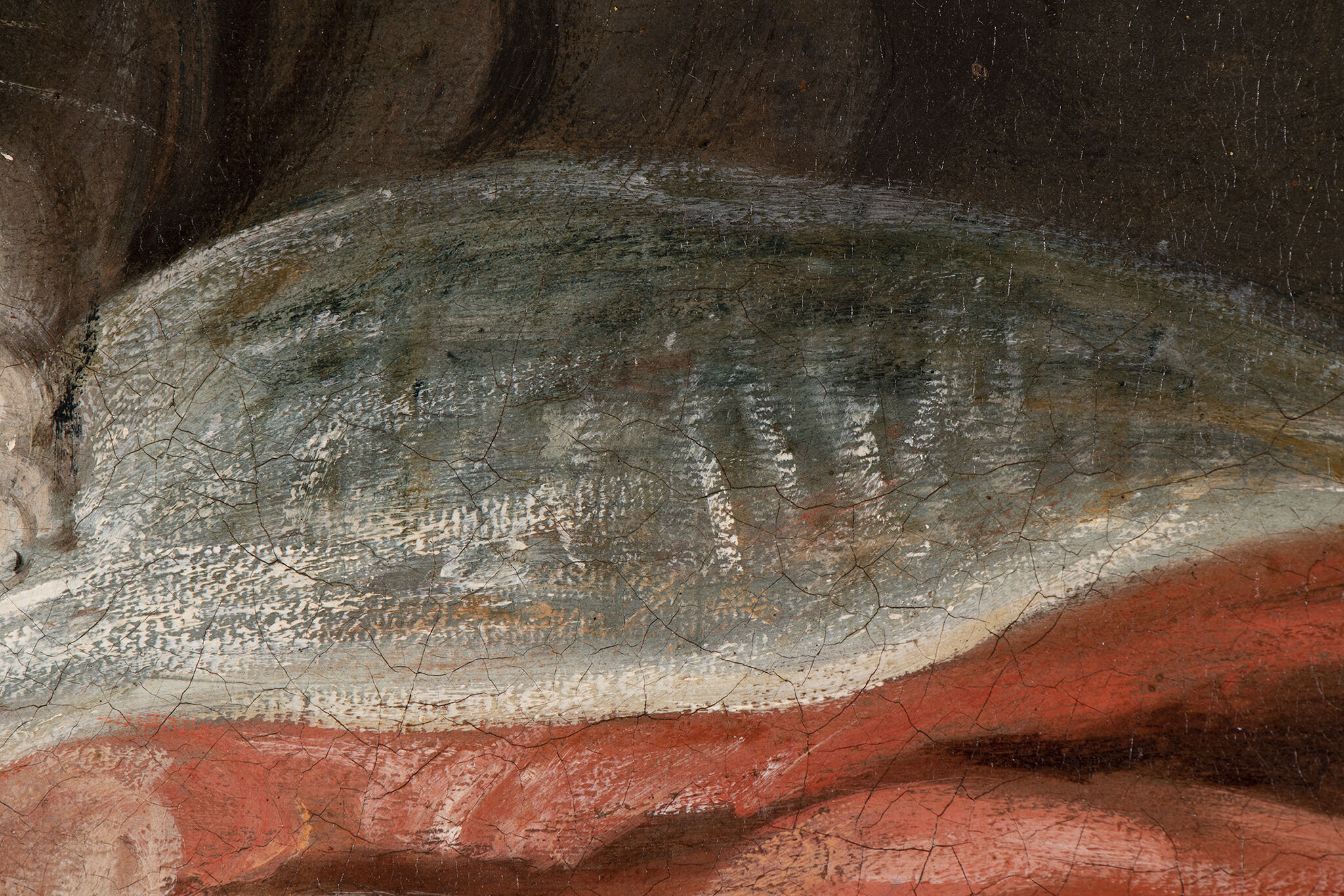 Fig. 6. Rapid zig-zag brushwork in the left background, with the thinly painted upper blue layer revealing the lower gray layer, Still Life with Cat and Fish (1728)