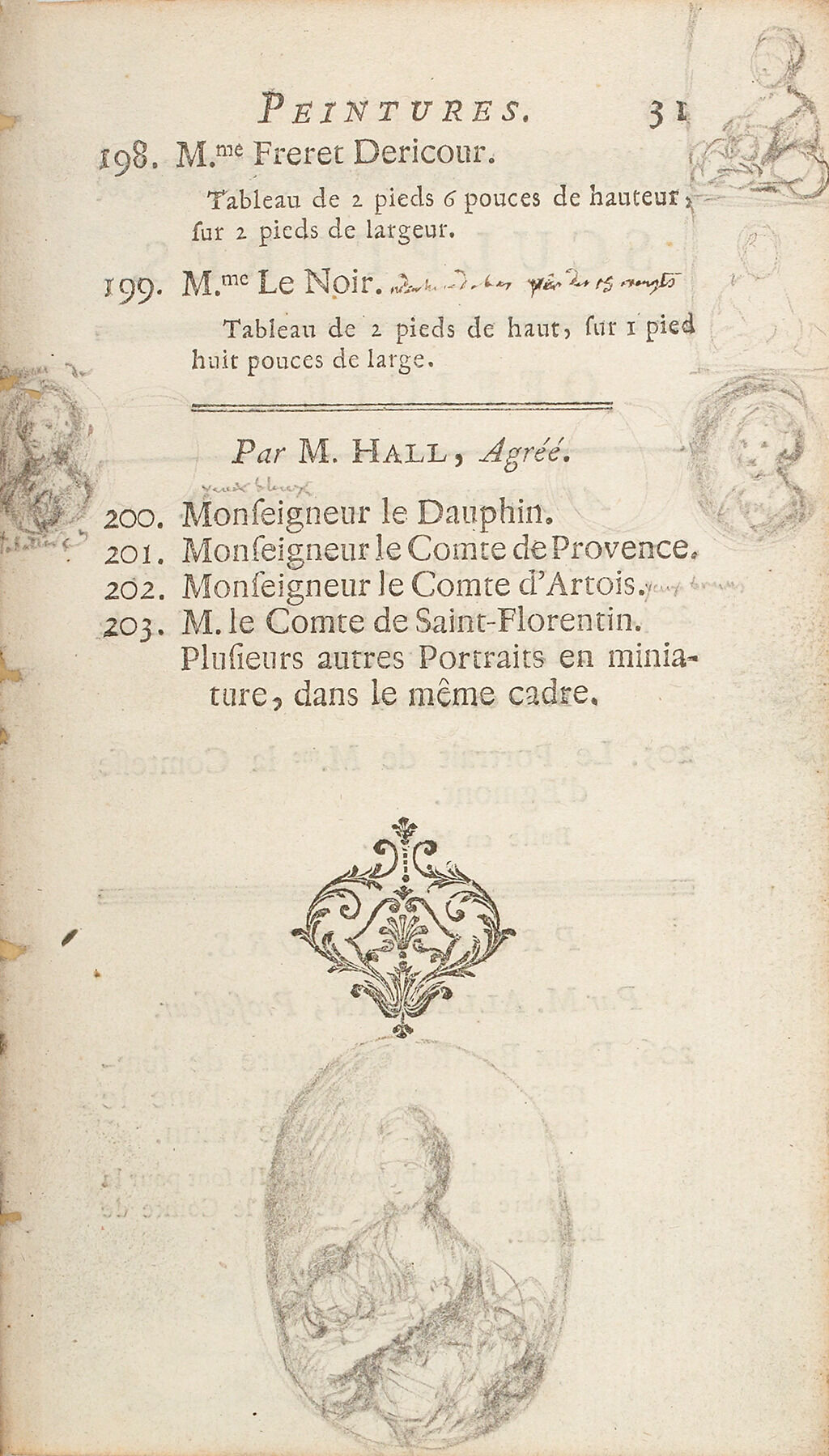 At the salon of that institution, the newly matriculated Duplessis exhibited portraits of Joseph Dominique de Cheylus, Bishop of Tréguier; Pierre Jean-Baptiste Gerbier; Dr. Majault; an unnamed prosecutor in the law courts of the Châtelet and official of the Académie de Saint-Luc; and Madame Le Noir. Belleudy, J.-S. Duplessis, peintre du roi, 1725–1802, 319, 323, 326, 329, 338.