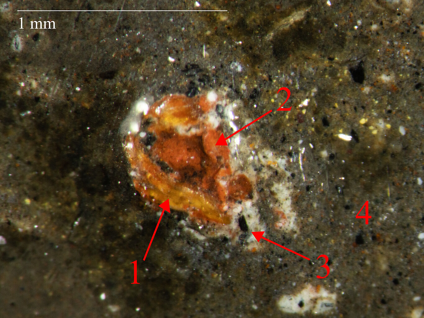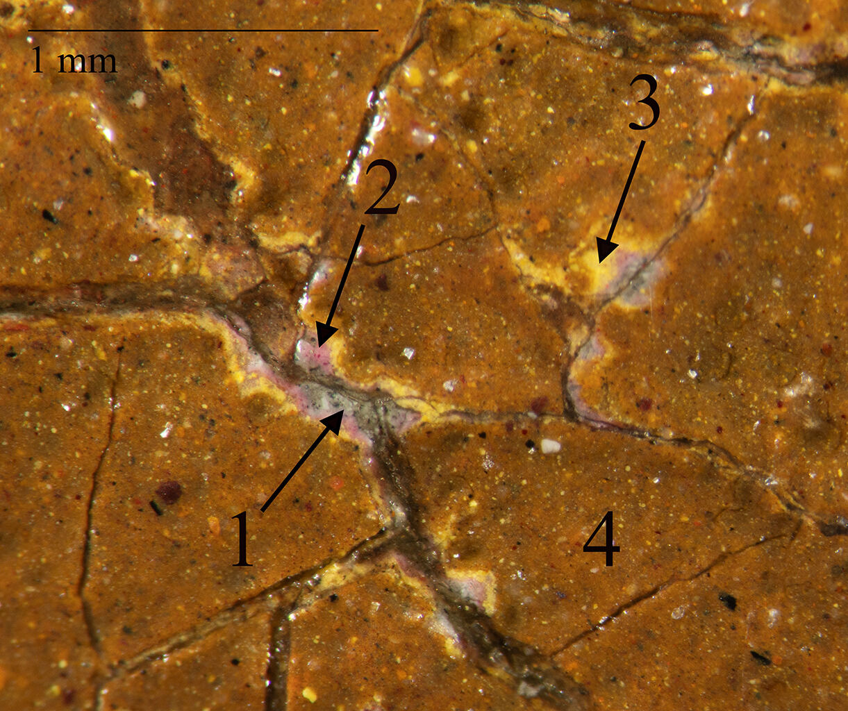 Fig. 14. Photomicrograph of Portrait of Madame Fréret d’Héricourt (1768–69), showing the paint structure of the yellow outer gown below the dog’s extended paw, with numbers corresponding to the order of application: light gray ground (1), light pink layer (2), bright yellow layer (3), and ochre paint layer (4)
