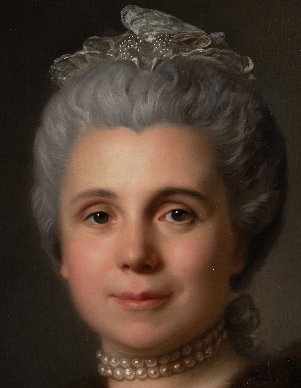 Duplessis efficiently constructed the pearl necklace, using the beige paint of the neck as a mid-tone, and simply adding shadows in brown and cool gray. Using a fine-tipped brush, dabs of white paint portray the reflection of light on each individual pearl (Fig. 8). This straightforward painting technique was also applied to the sitter’s lace bonnet, where the gray background remains visible to mimic the transparency of the fabric.