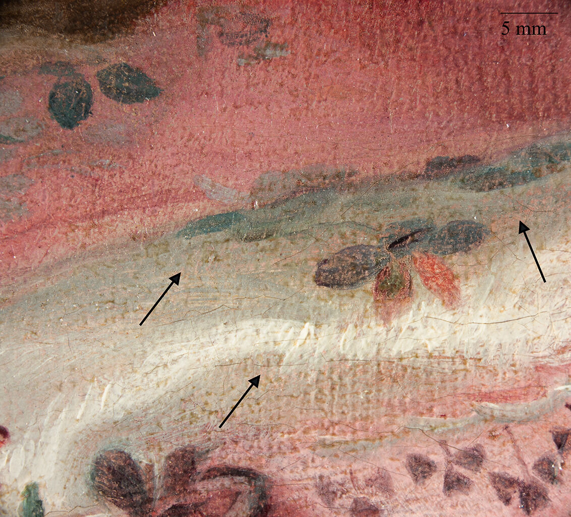 The fabrics in the sitter’s costume were skillfully rendered using distinct tonal underlayers and varied brushwork to convey different textures. In the pink and white dress, Duplessis appears to have created broad passages of color over an opaque, light pink underpainting (Fig. 9). Shades of pink, magenta, light gray, and white were layered to build these passages, with instances of wet-over-wet application. Delicate touches with a fine brush were used to create the embroidered floral design.