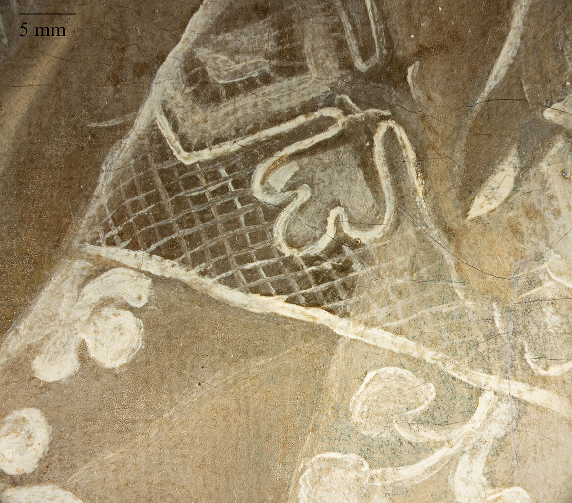 Unlike other parts of the sitter’s costume, Duplessis used drier brushwork over an opaque pale brown paint to capture the soft texture of the dark fur lining. Duplessis also meticulously painted the lace of the false sleeves over an ochre and dark brown underpainting, incorporating cool gray shadows and light beige highlights. The false sleeves appear to have been completed in one session, with wet-into-wet blending in the lower layers, along with finely painted, wet-over-wet crisscrossing brushstrokes to depict the delicate lace (Fig. 10).