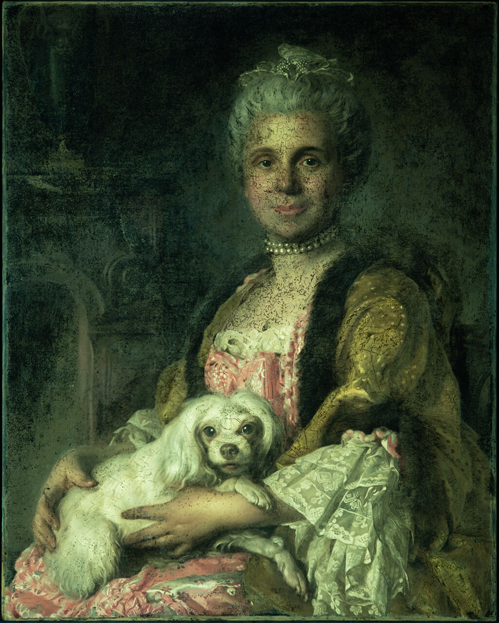The radiograph reveals dense brushstrokes, applied in a sweeping band, below the sleeve of the yellow outer gown and extending into the background, suggesting a change in the position of the lace sleeve (Fig. 15). Microscopic examination revealed pinkish beige paint beneath the upper layers of the dog’s fur, a change made visible due to extensive abrasionabrasion: A loss of surface material due to rubbing, scraping, frequent touching, or inexpert solvent cleaning. of the upper paint that occurred during a past solvent cleaning. Duplessis appears to have altered the placement of the sleeve to create the illusion of foreshortening in the arm while adjusting the placement of the sitter’s hand.
