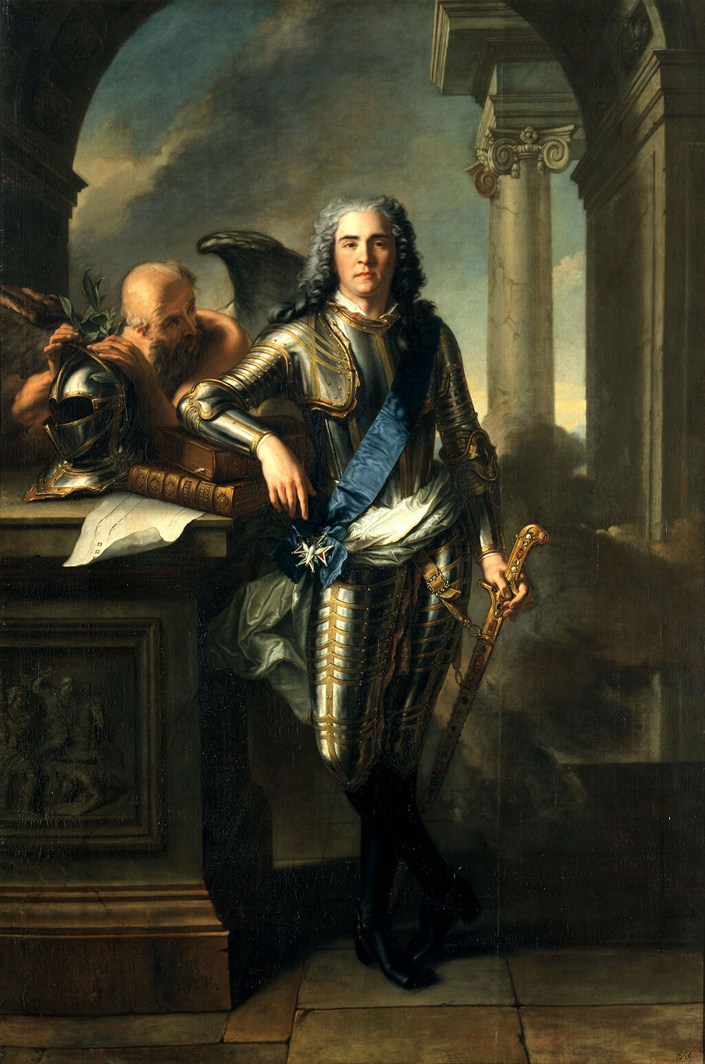 In 1719, the Nattier brothers were financially ruined in John Law’s Mississippi Bubble scheme.3The Mississippi Bubble “was a financial scheme in eighteenth-century France that triggered a speculative frenzy and ended in financial collapse.” See “Mississippi Bubble,” Encyclopedia Britannica, online edition, last edited October 18, 2002, https://www.britannica.com/event/Mississippi-Bubble. By August 1717, Antoine Crozat’s largely economic hold on Louisiana had been transferred to another monopoly, the Compagnie d’Occident or Compagnie du Mississippi, a scheme hatched by the Scottish economist John Law, who sold the idea to the Régent, Philippe, duc d’Orléans. To capitalize his plan for encouraging trade between France and its overseas colonies in the lower part of North America, Law created a royal bank and issued paper money backed by neither coinage nor bullion. As an enticement to attract gullible investors, he advertised Louisiana as an El Dorado where fortunes could be easily realized. The result was rampant speculation, and people like the Nattier brothers clamored to buy bonds and concessions of plantation land in the faraway colony. In the end, Law’s System collapsed in the so-called “Mississippi Bubble,” and many of those who had invested in it were left with worthless bonds, debt papers, and currency, or landed estates they were incapable of managing from afar. Jean Marc’s career, however, soon recovered. In 1721, he was hired to make drawings after paintings in the collection of the Regent, Philippe d’Orléans, the series of which was called the Recueil Crozat. He then associated himself with Jean-Baptiste Massé (1687–1767) on a vast engraving project recording Charles Le Brun’s ceiling decorations for the Palace of Versailles, specifically the Galerie des Glaces and the Salons de la Paix et de la Guerre. On the Feast of Corpus Christi in 1725, Nattier sent to the Exposition de la Jeunesse, near the Pont-Neuf in Paris, his full-length swagger portrait of Count Moritz Hermann of Saxony (Fig. 2), the son of Augustus the Strong, Elector of Saxony, and his Swedish mistress, Countess Aurora Von Königsmark. In it, the count is dressed in a suit of armor decorated with the insignia of the Polish Order of the White Eagle and is leaning on a sheathed saber.