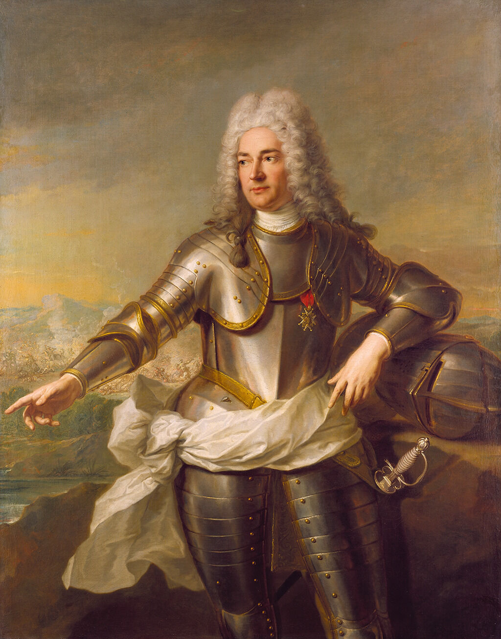 Jean Marc was summoned to Holland in 1717 on orders from the Russian Tsar Peter I (Peter the Great), who was by then in the second phase of his “Grand Embassy,” a learning and diplomatic tour of socially, culturally, and scientifically advanced Western European countries. During the time he resided in Amsterdam and the Hague, Nattier painted a three-quarter-length portrait of the Tsarina Catherine I (1717; The State Hermitage, Saint Petersburg) and produced a generic battle piece intended to commemorate Russia’s 1709 victory over the Swedish troops at Poltava in the Ukraine (Battle at Lesnaya, 1717; Pushkin Museum, Moscow). When the young French artist returned to Paris, he painted from life a likeness of the Tsar wearing a suit of plate armor (Fig. 1), which was the first of many military portraits of men wearing medieval-like suits of armor, with battle scenes raging in the background to set off their martial attire.1Peter had chosen to be depicted in a complete suit of armor by Godfrey Kneller in London in 1698 for his host King William III (The Royal Collection Trust, The Queen’s Gallery, Buckingham Palace, inv. no. RCIN 405645, https://www.rct.uk/collection/405645/peter-the-great-tsar-of-russia-1672-1725. They were meant to remind the viewer that male sovereigns, princes, and courtiers upheld the ancient traditions of Europe’s warrior class.