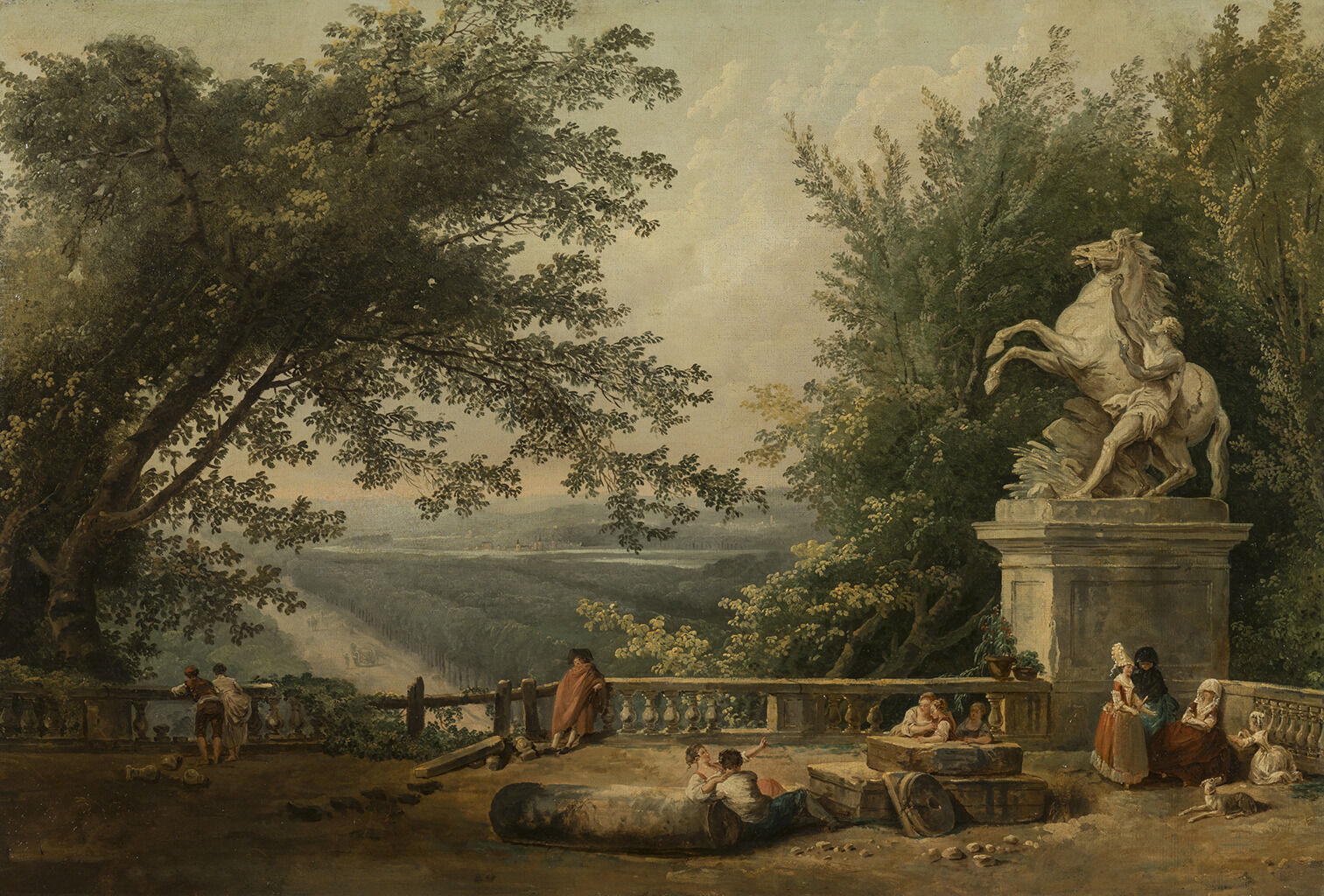 Long thought to be a view of the terraces of the Château de Marly, this painting remains a purposeful mystery. While there is no doubt that this is the work of Hubert Robert, the interpretation of its subject, proposed by various commentators over the last century, deserves to be revisited. When the painting was exhibited to the public in Paris in 1928, it was presented under the evocative title View from Marly Toward Saint-Germain-en-Laye. However, Marly’s gardens did not include elevated terraces with views of a neighboring valley, as seen in this painting. Quite to the contrary, Marly is nestled in the hollow of a valley, where it was a favorite retreat for Louis XIV and his court. Behind the estate was the “Marly Machine,” used to supply water to the Marly fountains as well as the château and gardens of Versailles. The Marly Machine was also within sight of the old and new châteaux of Saint-Germain-en-Laye. However, the château depicted by Robert does not correspond to either the new château (destroyed in 1810) or the old one, which today houses the National Museum of Archaeology. Finally, although the painting’s title had included the word “Marly” since at least 1928, the Nelson-Atkins Museum retitled it in 2022, during the preparation of this catalogue, in order to acknowledge its invented nature.1The title in 2022 was Imaginary View of the Terrace at the Château of Marly. For the painting’s relationship to Marly, see Sarah Catala, Hubert Robert: De Rome à Paris, exh. cat. (Paris: Galerie Éric Coatalem, 2021), 46. This revision not only addresses the complexity of connecting the painting to Robert’s documented views of Marly but also positions it within the tradition of capriccio, or architectural fantasy. Robert was an undisputed master of this genre in France during the second half of the eighteenth century.