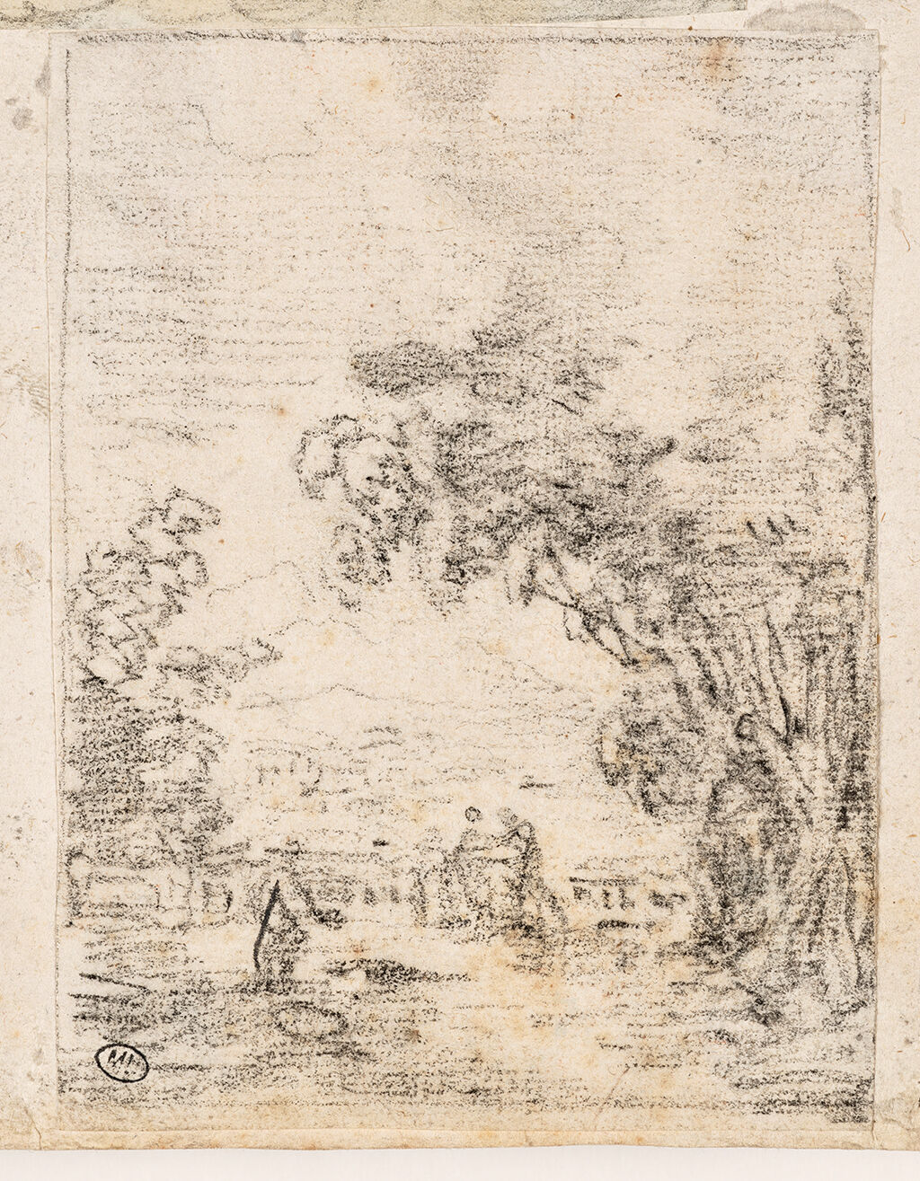 Fig. 2. Hubert Robert, Figures in a Park Bordered by an Overhanging Balustrade, ca. 1775, black chalk on laid paper, 4 9/16 x 3 1/2 in. (11.6 x 8.8 cm), Département des Arts graphiques, Musée du Louvre, Paris, RF 11567, recto