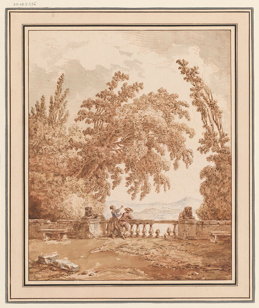 Fig. 3. Hubert Robert, Terrace of an Italian Villa, ca. 1765, watercolor, brown ink, and red chalk counterproof on laid paper, 13 15/16 x 11 7/16 in. (35.5 x 29 cm), National Museum, Warsaw, acc. no. Rys.Ob.d.556 MNW