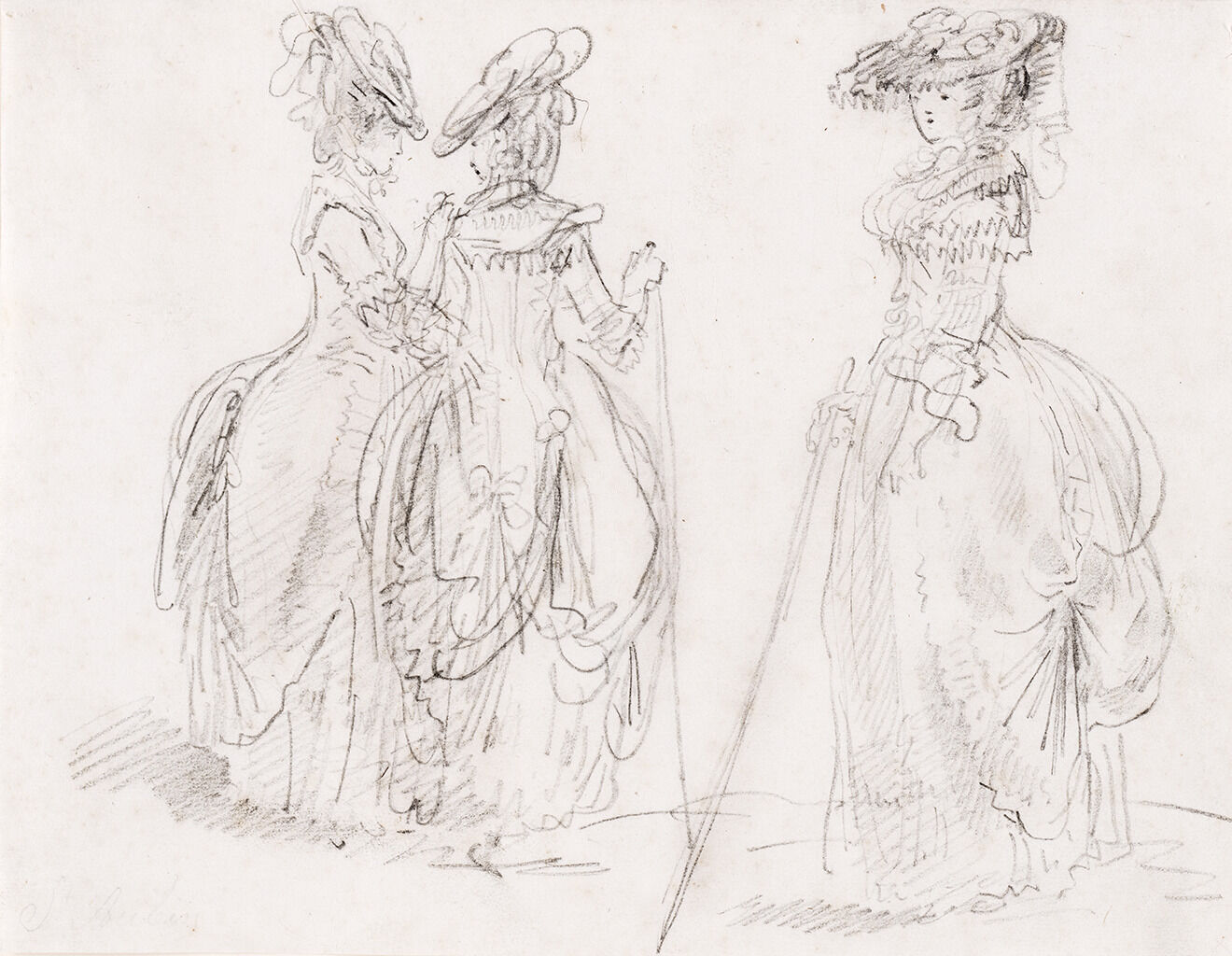 three elegant women, previously sketched in isolation with black chalk