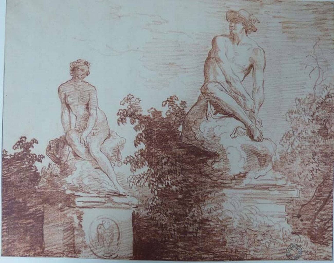Fig. 5. Hubert Robert, Two Statues in a Park, 1765–70, red chalk drawing on fine cream laid paper, 11 7/16 x 14 1/2 in. (29 x 36.8 cm), Musée des Beaux-Arts, Quimper, inv. no. 873-2-40