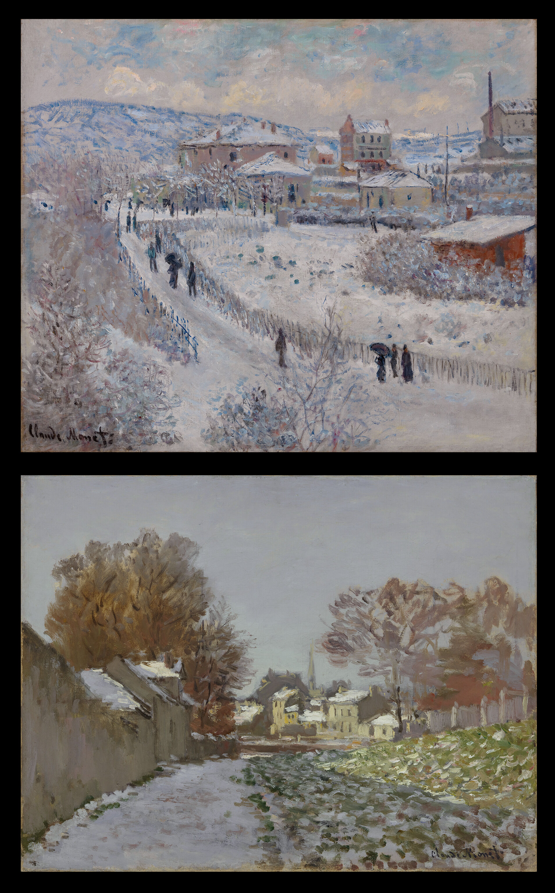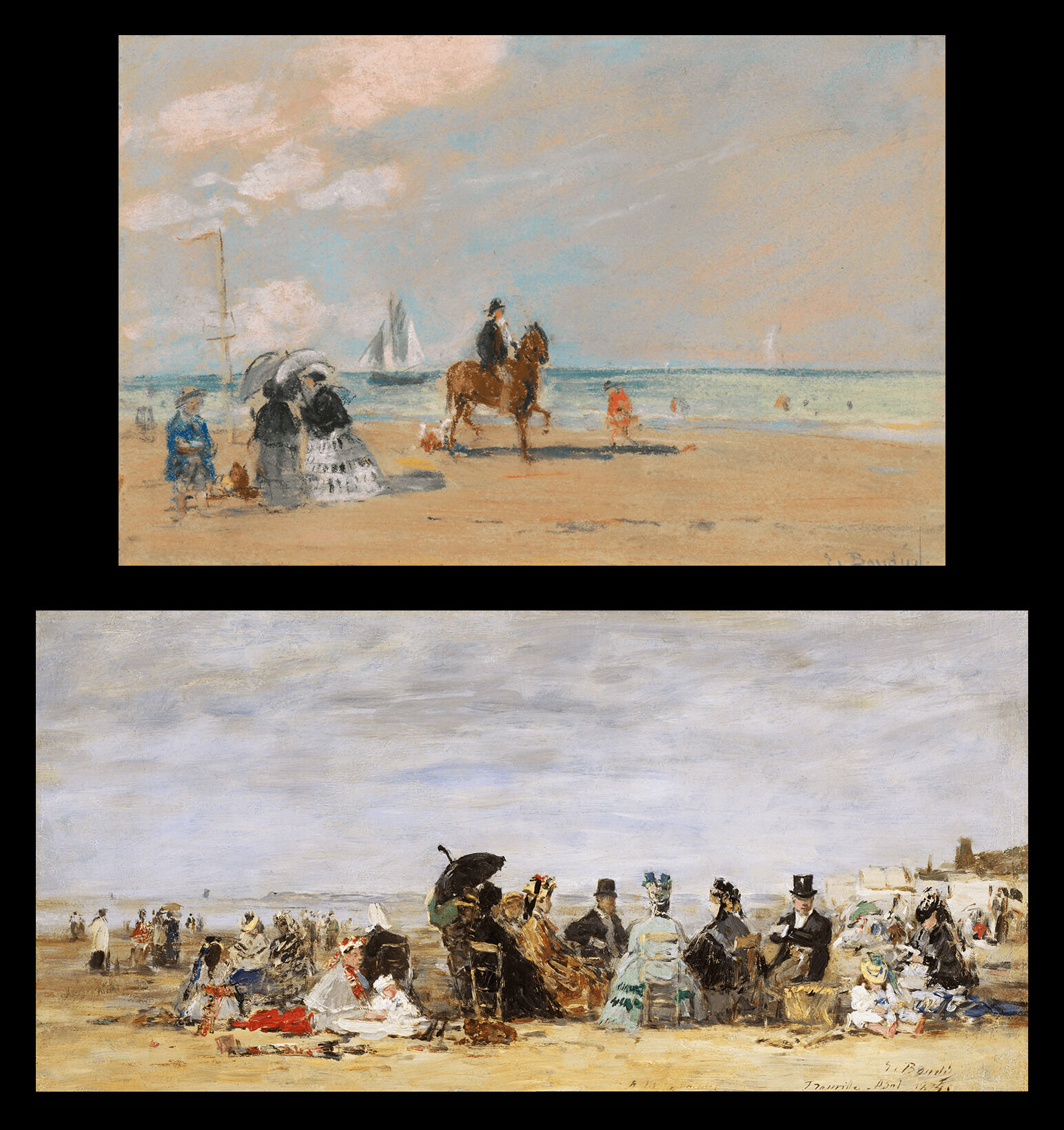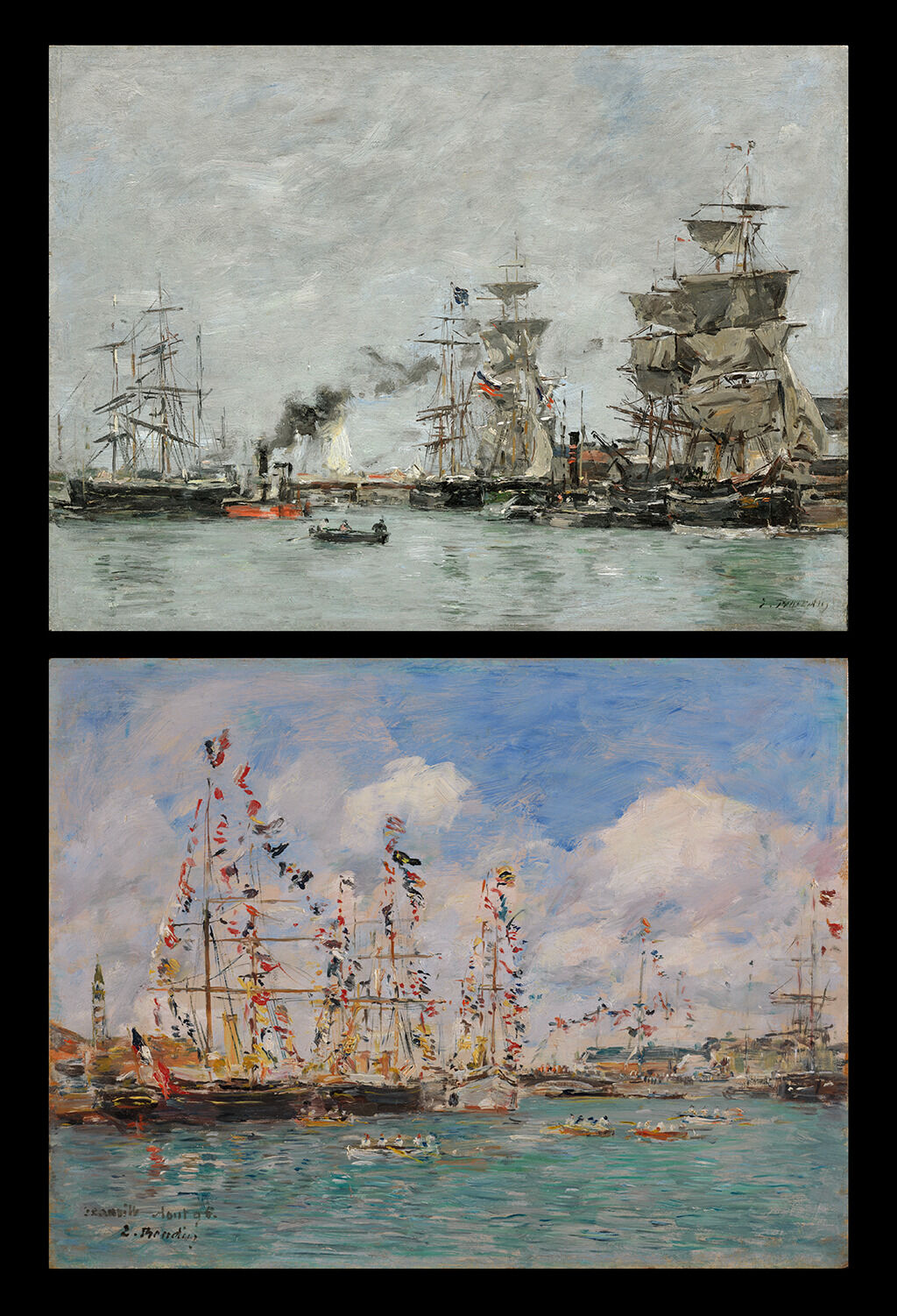 The artists known as the Impressionists focused on scenes of modern life, often presented from unusual vantage points. They used visible brushstrokes in bright colors to emphasize the depiction of light and its movement across surfaces. The Nelson-Atkins collection of Impressionism works includes paintings by Eugène Boudin, Gustave Caillebotte, Edgar Degas, Jean-Baptiste-Armand Guillaumin, Léon-Augustin Lhermitte, Claude Monet, Berthe Morisot, Camille Pissarro, Pierre-Auguste Renoir, and Alfred Sisley.