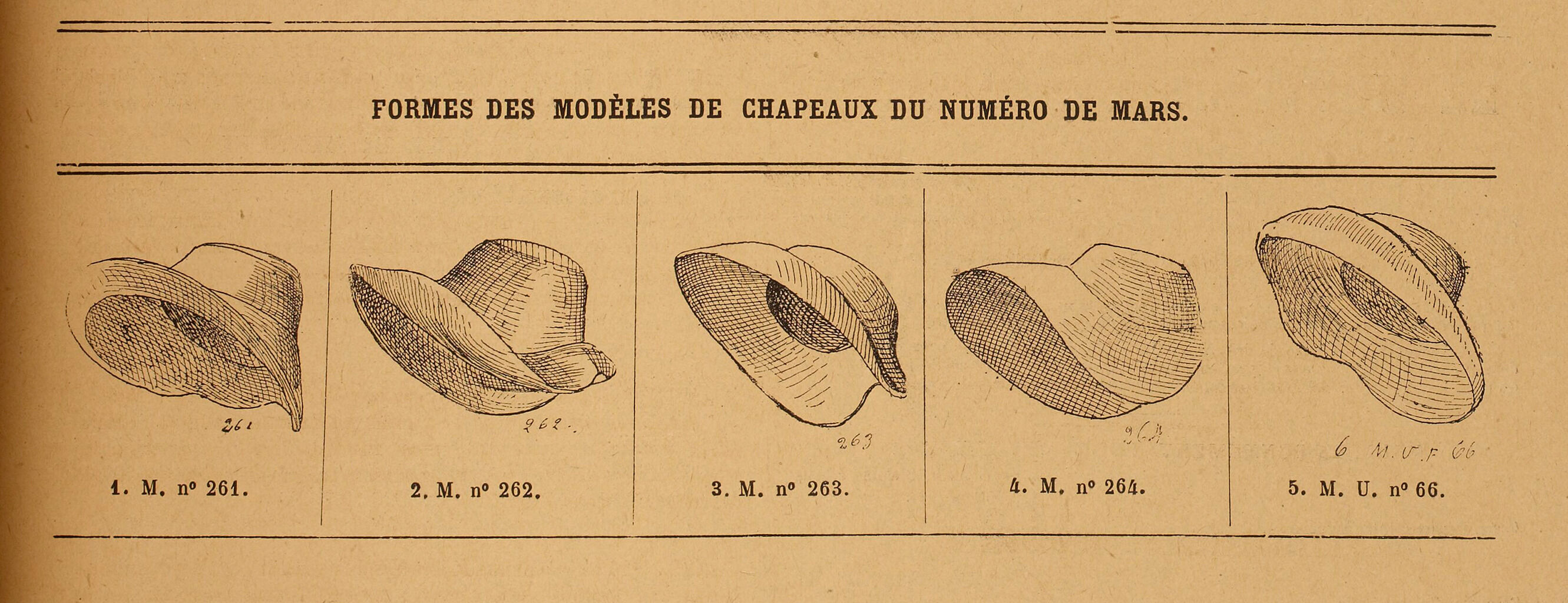 Fig. 1. “Formes des Modèles de Chapeaux du Numéro de Mars” by Madame Heitz-Boyer, from La Modiste Universelle, March 1882, lithograph on paper, Bibliothèque nationale de France, Paris, département Réserve des livres rares, FOL-V-832