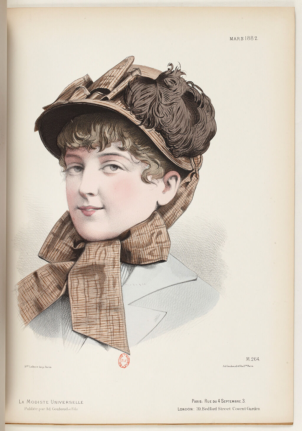 Fig. 2. “Bonnet fermière” by Madame Heitz-Boyer, from La Modiste Universelle, March 1882, lithograph on paper, Bibliothèque nationale de France, Paris, département Réserve des livres rares, FOL-V-832