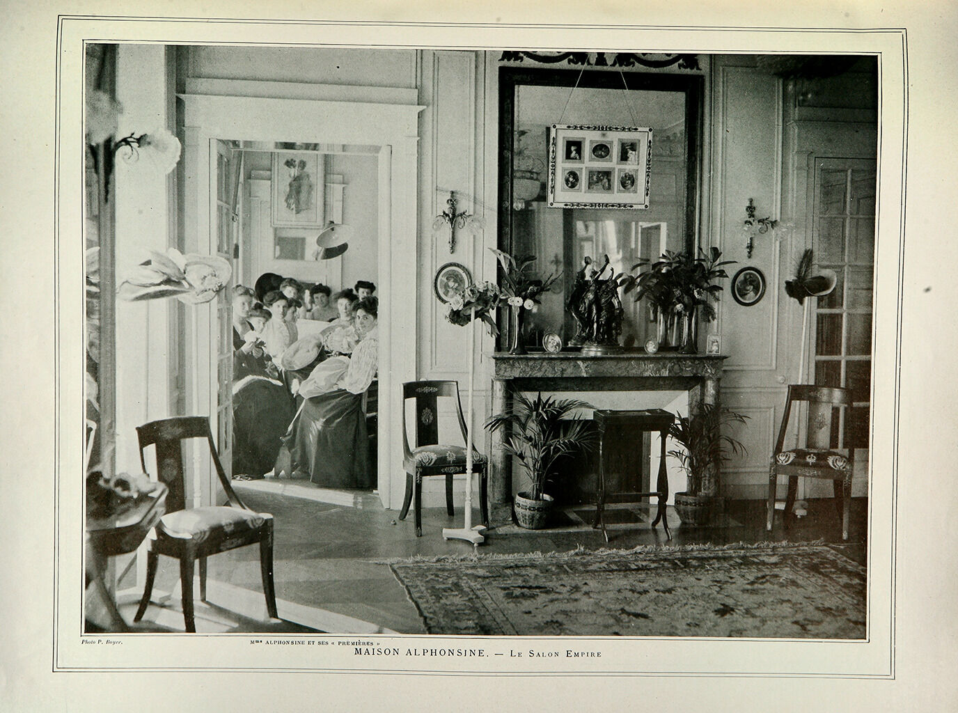 A hat is quite a poem; it’s a symphony, it’s a melody, it’s always a masterpiece to create.1Maurice Praslières, “Un Grande Modiste au XXe Siècle,” Les Modes, no. 46 (October 1904): 20. “Mais c’est tout un poème qu’un chapeau; c’est une symphonie, c’est une mélodie, c’est toujours un chef-d’oeuvre à créer.” All translations by Meghan L. Gray, unless otherwise noted. Written to advertise the modiste Alphonsine’s new headquarters, the article emphasizes all her best qualities, including her ability to speak six languages and her extensive travels, and pays particular attention to her appreciation of great eighteenth-century artists like Jean Marc Nattier (1685–1766), François Boucher (1703–70), and Antoine Watteau (1684–1721). The author likens Alphonsine’s expertise to the highest echelons of the artistic hierarchy.