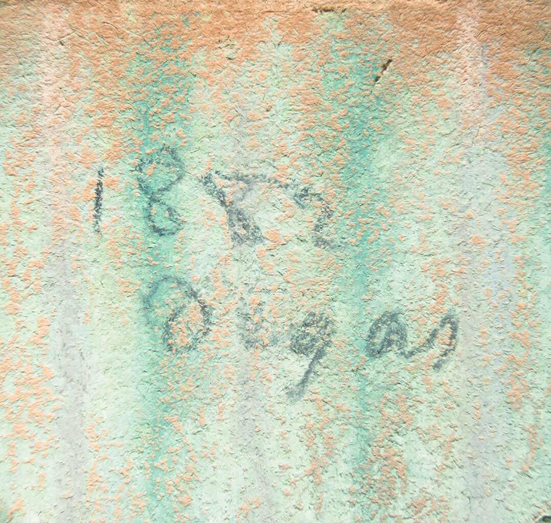 There is no evidence of fixativefixative: An adhesive or varnish that is applied to the surface of powdery media (pastel, chalk, charcoal, or graphite pencil) to prevent smudging or smearing. Fixatives may be applied during the composition process, so that new layers of media can be added without disturbing the underlayers, or after the artwork is complete. Historic fixatives include natural resins, vegetable gums or starches, animal or fish glues, casein, egg white, and a variety of other materials. In the nineteenth century, cellulose nitrate and other early synthetic polymers were available, and in the twentieth century, acrylics and polyvinyl co-polymers were included in fixative solutions. Until the early twentieth century, when methods for containing pressurized gasses were developed and disposable spray cans became common, the fixative could be spattered over the paper with a brush or applied with an atomizer (also called a blow-pipe or mouth sprayer)., and, possibly in a complement to the colors of the wallpaper, the artist signed and dated the drawing at upper left with the tip of a blue pastel: “1882 Degas” (Fig. 9).