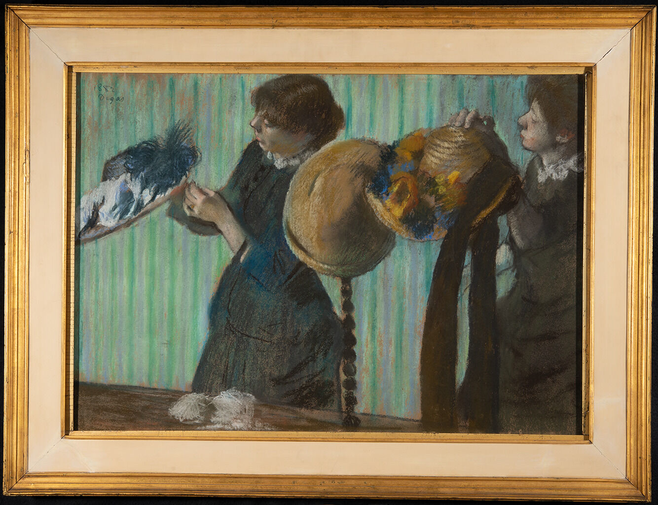 Junior Milliners was completed during a period when Edgar Degas depicted both the Parisian well-to-do and the working classes in both canvas and pastelpastel: A type of drawing stick made from finely ground pigments or other colorants (dyes), fillers (often ground chalk), and a small amount of a polysaccharide binder (gum arabic or gum tragacanth). While many artists made their own pastels, during the nineteenth century, pastels were sold as sticks, pointed sticks encased in tightly wound paper wrappers, or as wood encased pencils. Pastels can be applied dry, dampened, or wet, and they can be manipulated with a variety of tools including paper stumps, chamois cloth, brushes, or fingers. Pastel can also be ground and applied as a powder, or mixed with water to form a paste. Pastel is a friable media, meaning that it is powdery or crumbles easily. To overcome this difficulty, artists have used a variety of fixatives to prevent image loss. paintings. Junior Milliners focuses on two young female shop assistants as they decorate fashionable hats. In addition to the pastel painting materials and technique, this entry focuses on the frame, which is original to the artwork and appears to have been designed by Degas.