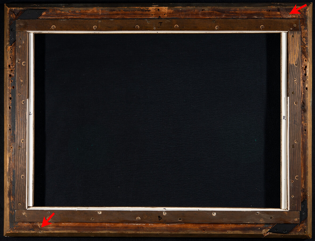 Fig. 11. The back of the frame with the spline at at lower left and upper right indicated with arrows. The large metal pieces on the lower corners and at upper left and lower right are old metal repairs to the miters. The conservation department at the Nelson-Atkins Museum of Art built out the back of the frame with beveled wooden strips to accommodate a modern framing package and lined the rebate to better protect the artwork, Junior Milliners (1882).