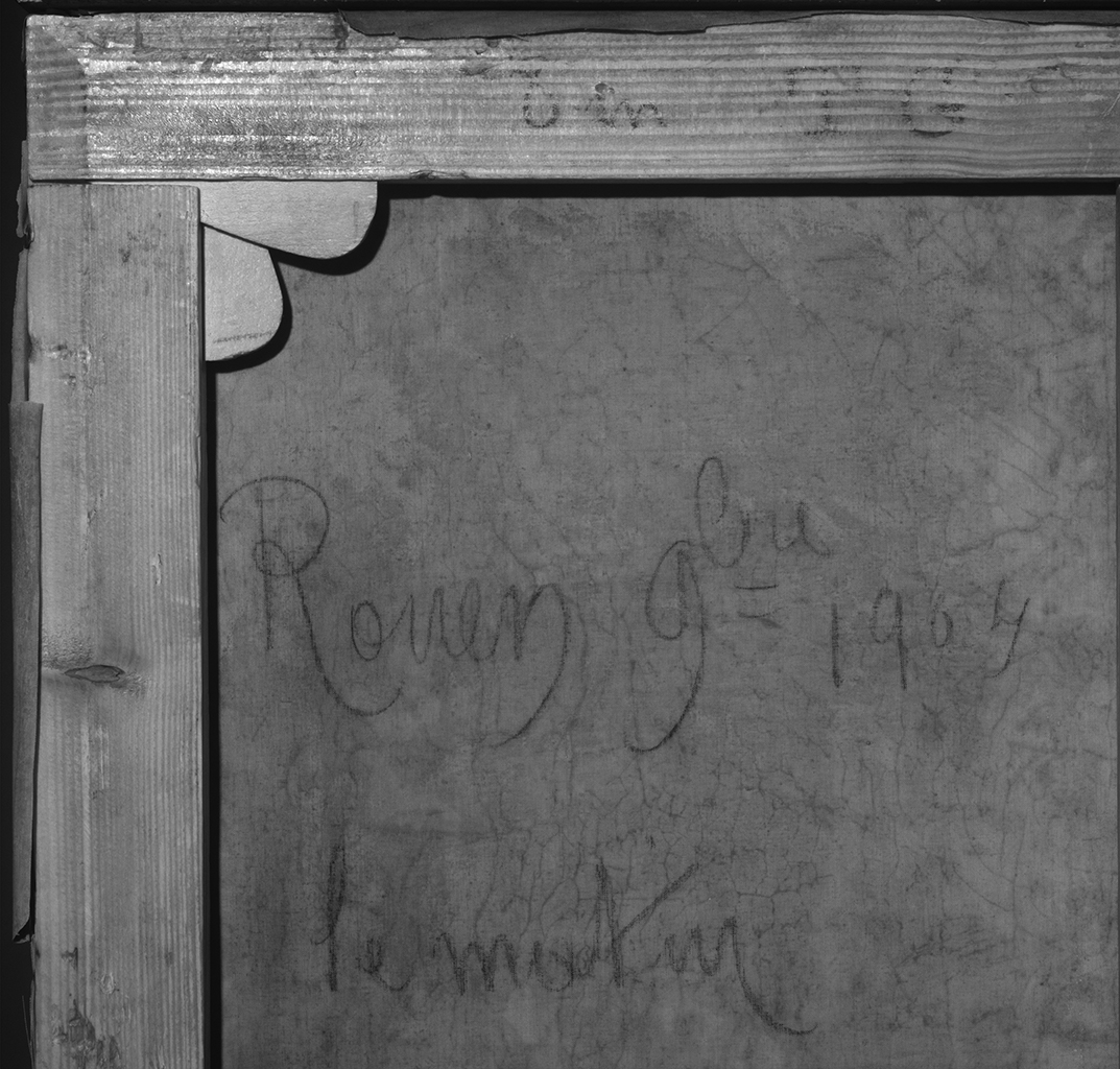 Guillaumin often recorded detailed information on the back of his paintings, noting the date, time, weather, and location to maintain consistent lighting conditions during successive painting sessions.5Jacqueline Derbanne, “Saint-Palais, La Pierrière at Low Tide by Armand Guillaumin,” Museo Nacional Thyssen-Bornemisza website, accessed July 13, 2025, https://www.museothyssen.org/en/collection/artists/guillaumin-armand/saint-palais-pierriere-low-tide. On the canvas verso of Morning, Rouen, a cursive inscription in charcoal or chalk confirms that the painting was executed in Rouen in November 1904: “Rouen 9bre 1904 / le matin” (Fig. 6).6See accompanying catalogue entry by Marcereau DeGalan. A secondary notation on the top stretcher, “8hr TG,” indicates that it was painted at 8 a.m. in gray weather, with “TG” serving as shorthand for “temps gris.”7Derbanne, “Saint-Palais, La Pierrière at Low Tide by Armand Guillaumin.” This note reflects Guillaumin’s deliberate efforts to capture the same atmospheric conditions across his early morning sessions. Infrared (IR) photographyinfrared (IR) photography: A form of infrared imaging that employs the part of the spectrum just beyond the red color to which the human eye is sensitive. This wavelength region, typically between 700-1,000 nanometers, is accessible to commonly available digital cameras if they are modified by removal of an IR blocking filter that is required to render images as the eye sees them. The camera is made selective for the infrared by then blocking the visible light. The resulting image is called a reflected infrared digital photograph. Its value as a painting examination tool derives from the tendency for paint to be more transparent at these longer wavelengths, thereby non-invasively revealing pentimenti, inscriptions, underdrawing lines, and early stages in the execution of a work. The technique has been used extensively for more than a half-century and was formerly accomplished with infrared film." of The Barges revealed a similar inscription, previously hidden on its darkened canvas verso: “Rouen Xbre 1904 / le pré aux loups / le matin” (Fig. 7).8The author thanks Meghan Gray, curatorial associate of European paintings and sculpture, for assistance in transcribing and deciphering the middle line of the inscription. This dates the painting to the morning hours of December 1904 and places it at the Quai du Pré aux Loups in Rouen.9Guillaumin employed an older Latin-based system for naming months. This annotation method is discussed in relation to the inscription on Morning, Rouen in the accompanying catalogue entry by Marcereau DeGalan. Guillaumin appears to have completed Morning, Rouen a month before he returned to the same location to paint The Barges.