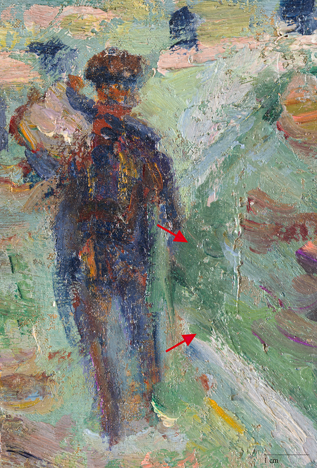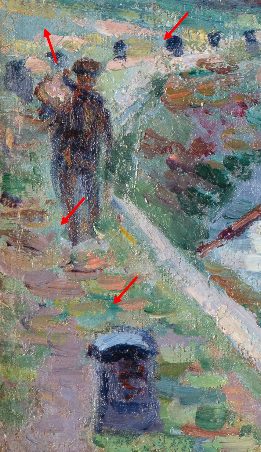 Fig. 14. Photomicrograph of the shore in Morning, Rouen (1904). Red arrows point to the dabs of green paint that cover part of the diagonal shoreline and the standing figure.