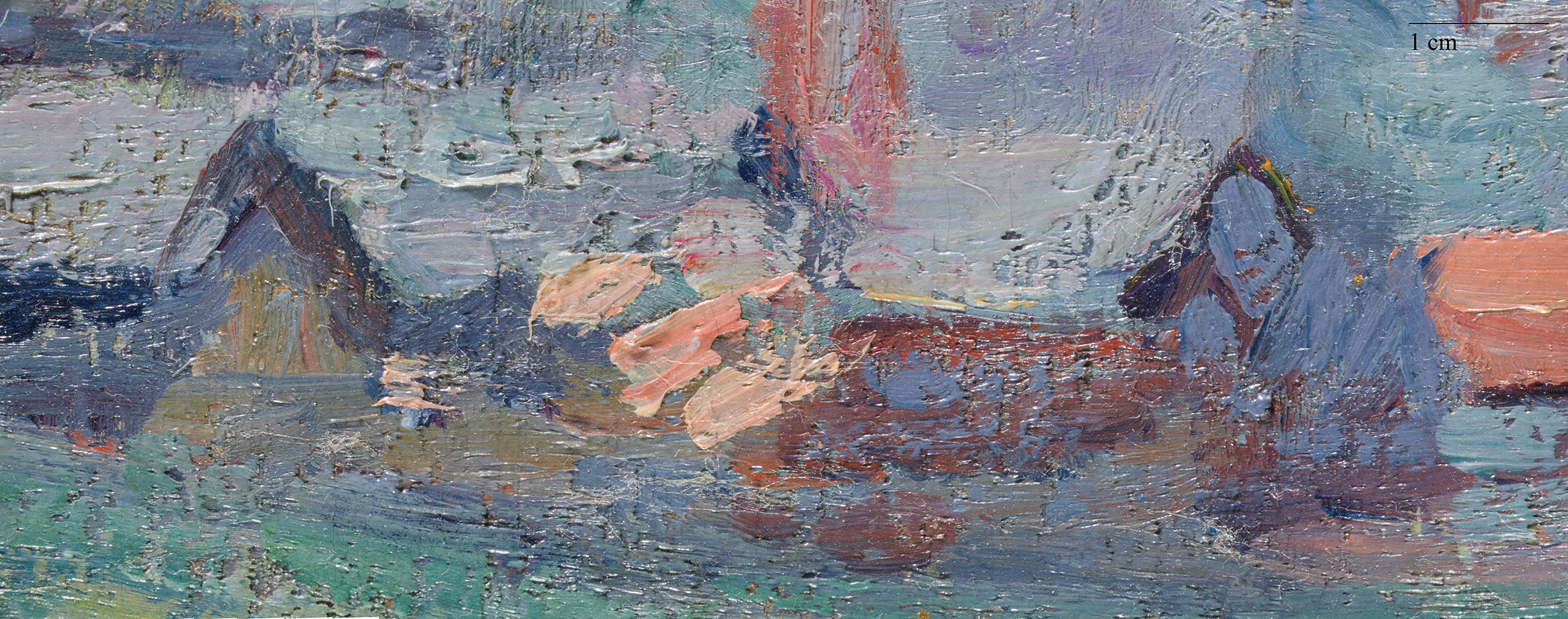 Fig. 11. Photomicrograph of the factories in Morning, Rouen (1904), showing a mixture of wet-into-wet, wet-over-wet, and wet-over-dry paint application