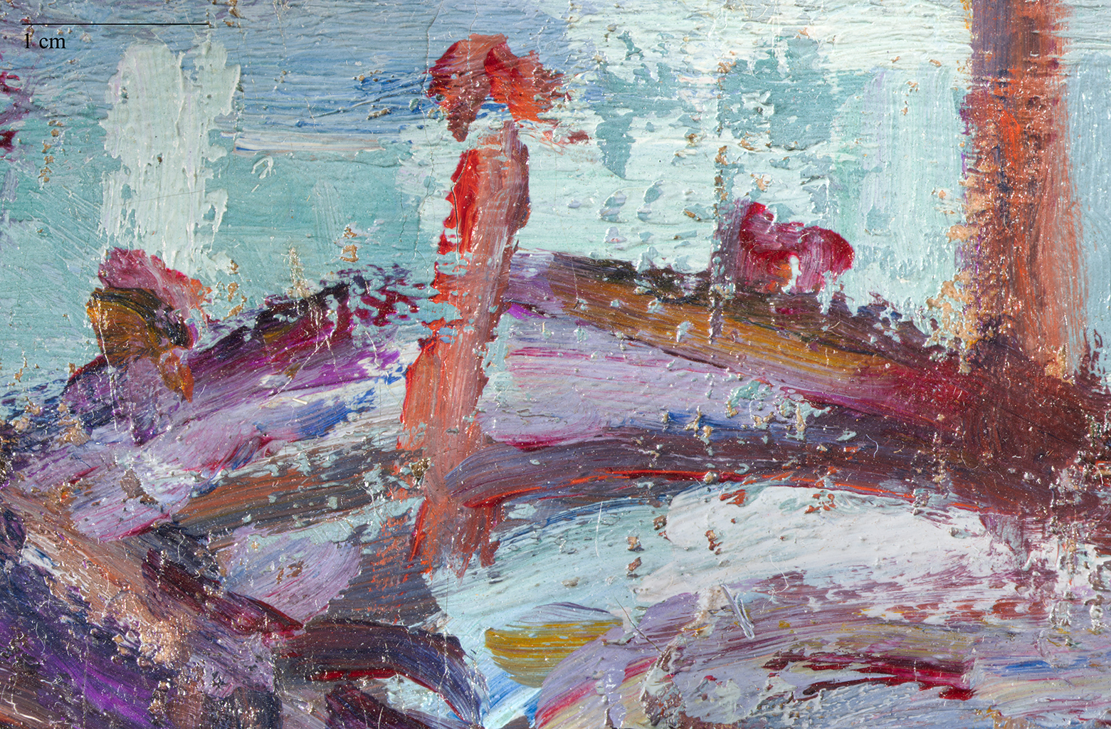 Fig. 16. Detail of the mooring posts in The Barges (Les Péniches), 1904, Musée Bonnat-Helleu. Red arrows point to dabs of light-blue paint on top of the dark bluish-purple paint layers. Photo courtesy of Caroline Martens, CICRP.