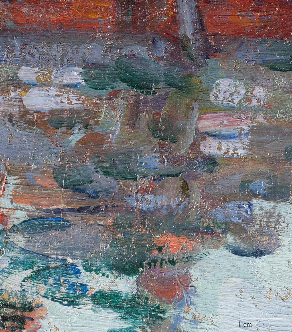 Fig. 17. Detail of the far-right boat in The Barges (Les Péniches), 1904, Musée Bonnat-Helleu, showing drying cracks in the upper paint layers. Photo courtesy of Caroline Martens, CICRP.