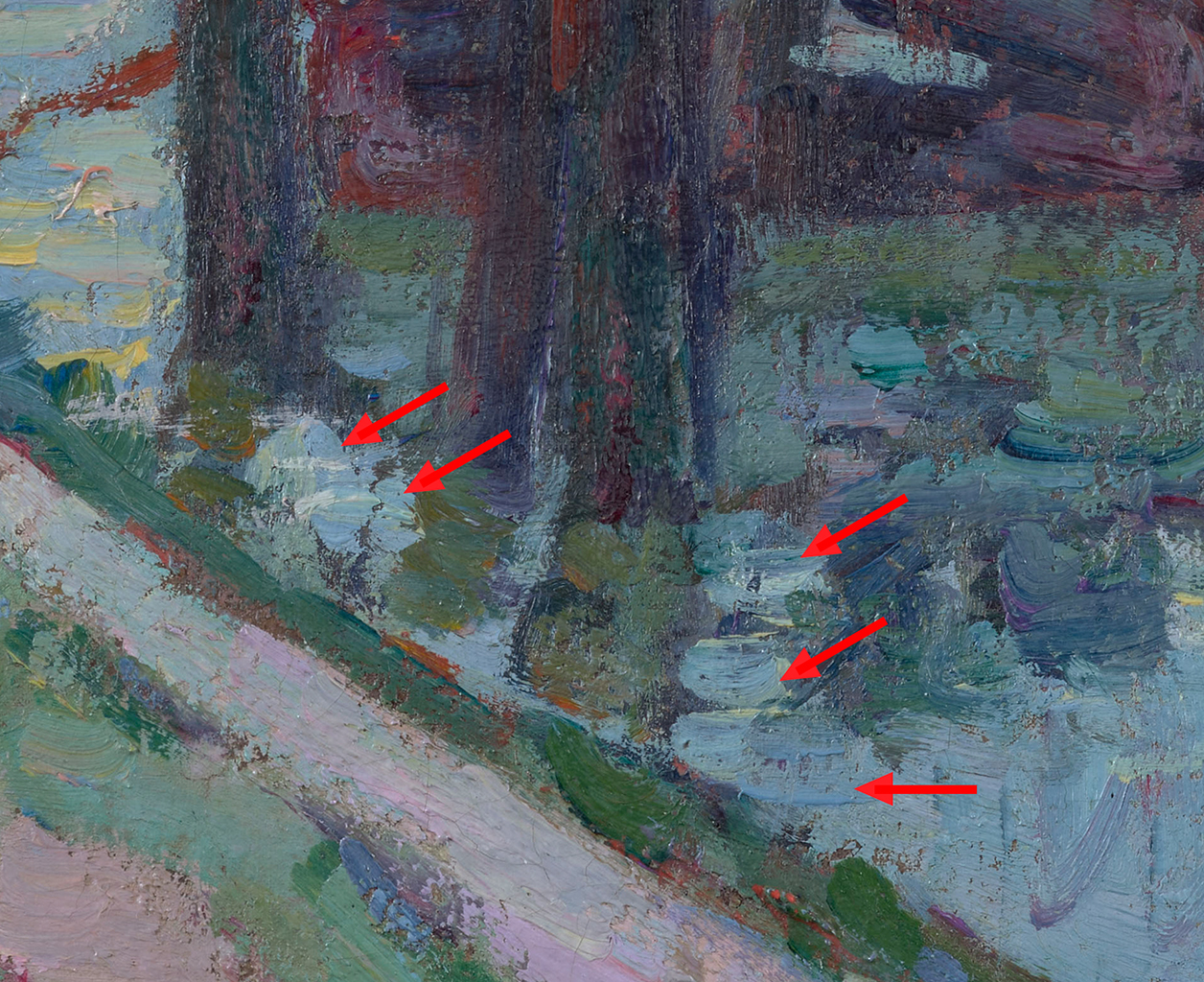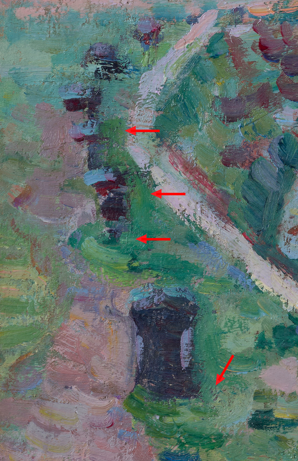 Fig. 10. Detail of the shore in Morning, Rouen (1904). Red arrows point to the turquoise blue underpainting below the green and pink dabs of paint.