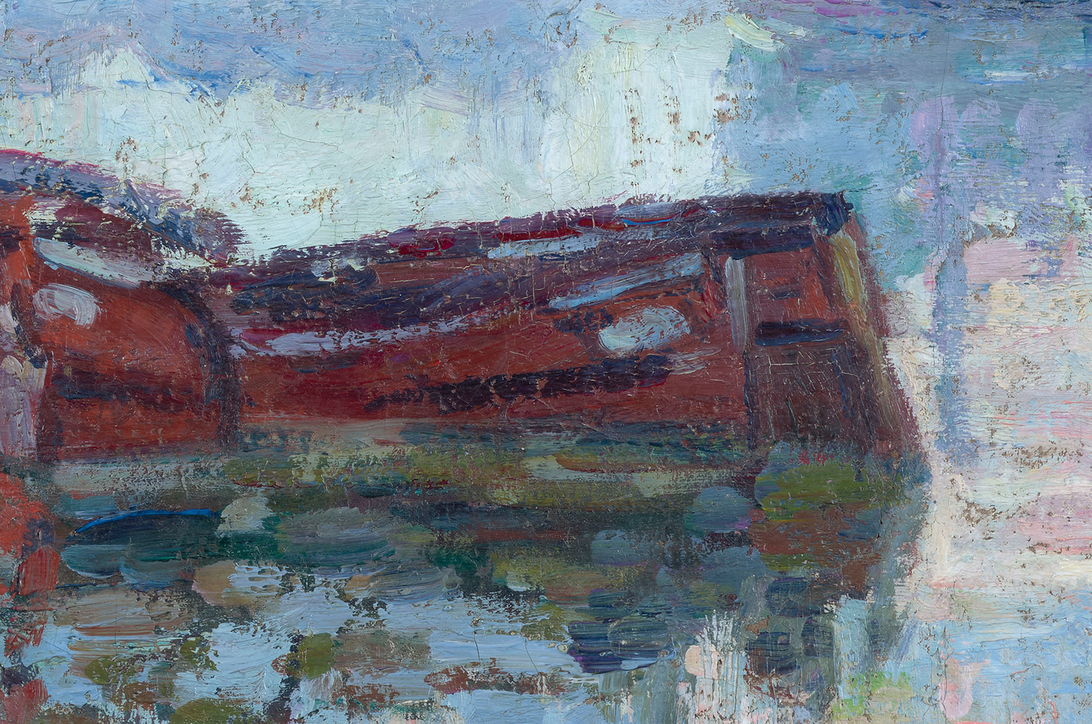 The Barges was also executed on a commercially primed, extremely fine, plain-weave canvas with a lean off-white ground.