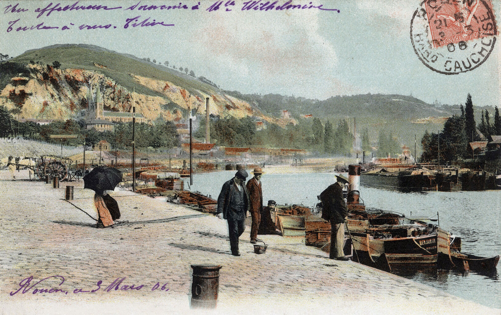 Guillaumin made two visits to Rouen in 1898 and 1904, producing at least ten views of the Seine from its banks.9See Armand Guillaumin, The Seine of Rouen, ca. 1898, oil on canvas, 15 1/8 x 18 1/8 in. (38.5 x 46 cm), sold at Christie’s, London, “Impressionist and Modern Art Day Sale,” June 23, 2016, lot 291, https://www.christies.com/en/lot/lot-6009060; Armand Guillaumin, The Banks of the Seine of Rouen, ca. 1898, oil on canvas, 18 1/8 x 24 in. (46 x 61 cm), sold at Sotheby’s, New York, “Impressionist and Modern Art Day Sale,” May 17, 2017, lot 193, https://www.sothebys.com/en/auctions/ecatalogue/2017/impressionist-modern-art-day-sale-n09711/lot.193.html; Armand Guillaumin, The Corneille Bridge, ca. 1898, oil on canvas, 18 1/8 x 24 in. (46 x 61 cm), sold at Sotheby’s, Paris, “Art Impressionniste et Moderne Day Sale,” March 30, 2021, lot 251, https://www.sothebys.com/en/buy/auction/2021/art-impressionniste-et-moderne-day-sale/le-pont-de-corneille-a-rouen; Armand Guillaumin, Snow in Rouen: The Barges, ca. 1904, oil on canvas, 19 3/4 x 25 1/2 in. (50 x 65 cm), Musée Bonnat-Helleu, Bayonne, RF 1937 78, https://www.musee-orsay.fr/fr/oeuvres/neige-rouen-les-peniches-75130; Armand Guillaumin, The Barges (Les Péniches), 1904, oil on canvas, 21 7/16 x 25 9/16 in. (54.5 x 65 cm), Musée Bonnat-Helleu, Bayonne, RF 1937 87, https://www.musee-orsay.fr/fr/oeuvres/peniches-75139; Armand Guillaumin, Snow Melting in Rouen, ca. 1904, oil on canvas (no dimensions given), Musée des Beaux-Arts, Lyon, https://art.rmngp.fr/fr/library/artworks/armand-guillaumin_neige-fondant-a-rouen_huile-sur-toile; Armand Guillaumin, The Seine Upstream of Rouen, ca. 1904, oil on canvas, 19 1/4 x 25 5/8 in. (49 x 65.2 cm), sold at Sotheby’s, London, “Impressionist and Modern Art Day Sale,” February 4, 2009, lot 175, https://www.sothebys.com/en/auctions/ecatalogue/2009/impressionist-modern-art-day-sale-l09604/lot.175.html; Armand Guillaumin, Banks of the Seine, near Rouen, 1904, oil on canvas, 21 x 26 in. (54.6 x 66.1 cm), sold at Christie’s, New York, “Impressionist and Post-Impressionist Art (Day Sale),” November 9, 1999, lot 245, https://www.christies.com/en/lot/lot-1609375; Armand Guillaumin, The Barges of Rouen, 1904, oil on canvas, 21 x 31 1/2 in. (53 x 80 cm), private collection, reproduced in Anne Galloyer, ed., Armand Guillaumin (1841–1927): L’Impressioniste Fauve, exh. cat. (Chatou, France: Musée Fournaise, 2003), 46–47. The inscription on the back of Morning, Rouen, reads “Rouen 9bre 1904/le matin,” dating the canvas to November of that year.10The abbreviation “bre” follows the older Latin-based system of month names, where months from September onward retained their original Roman-numerical roots (Septem = 7, Octo = 8, Novem = 9, and so on) with the addition of “bre” following the number. This inscription is discussed in relation to The Barges (Fig. 2) in the forthcoming technical essay by Kress paintings conservation fellow Sophia Boosalis. Guillaumin had recently been in the Netherlands for nine months, from September 1903 until the end of June 1904, marking his first time away from France. It is unclear when exactly he left for Rouen, but in all likelihood it was late summer into at least early winter, based on the known works cited in Christopher Gray, Armand Guillaumin (Chester, CT: Pequot Press, 1972), 58n12. The painting offers a view looking east toward the Côte Sainte-Catherine, or Sainte-Catherine Hill, but avoids its panoramic vista. Guillaumin instead chose to center the river as a reflective surface for his explosive use of color. A solitary figure traverses the riverbank, evoking both industry and leisure—a dual characteristic of modernity. A second version of the composition (Fig. 2), executed at roughly the same time and under similar atmospheric conditions, tightens the composition at the right and thus eliminates the passage of water that, in the Nelson-Atkins picture, accommodates the reflection of colored smoke. It also omits the solitary figure on the riverbank. The comparison reveals Guillaumin working in a loosely serial mode, adjusting elements from one version to the next, but it is the Nelson-Atkins canvas that most fully exploits the chromatic possibilities of the scene. A contemporary postcard of the same location provides a historical reference, offering a nearly identical perspective of the industrial waterfront (Fig. 3). While the postcard faithfully documents the industrial site, Guillaumin’s transformation of this urban setting into a radiant tableau highlights his prioritization of color and movement over mimetic representation.