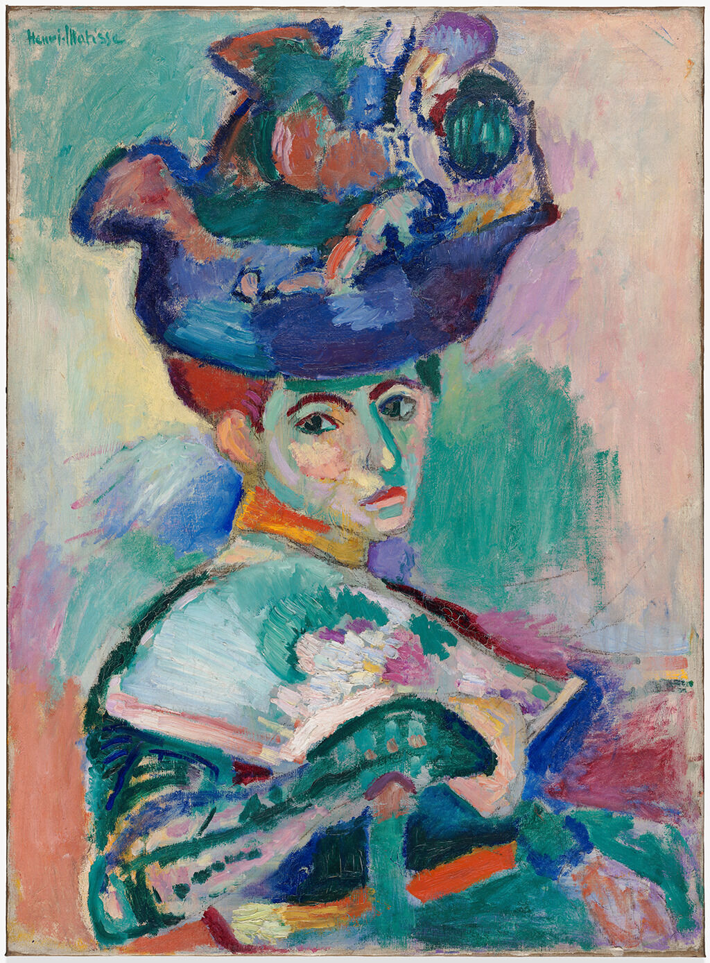 From 1886 to 1888, Guillaumin was the Impressionist with the closest connections to Van Gogh, sharing with him the radical idea of a studio modeled on medieval workshops.14Rainer Budde, ed., Vom Spiel der Farbe: Armand Guillaumin (1841–1927); ein vergessener Impressionist, exh. cat. (Cologne: Wallraf-Richartz-Museum, 1996), 35–36. Van Gogh greatly admired Guillaumin’s use of vibrant, unconventional color, which would influence his own expressive palette.15There are thirty-six letters among the corpus of Van Gogh correspondence that mention Guillaumin; see Leo Jansen, Hans Luijten, and Nienke Bakker, eds., Vincent Van Gogh: The Letters, online edition (Amsterdam and The Hague: Van Gogh Museum and Huygens, 2009), https://vangoghletters.org/vg/search/simple?term=Guillaumin. In a letter to Vincent van Gogh, Theo van Gogh specifically calls out Gullaumin’s use of vigorous color, noting that one finds “the same pink, orange, and violet blue patches, but his touch is vigorous.” See Theo van Gogh, Paris, to Vincent van Gogh, October 22, 1889, published in Jansen et al., Letters, no. 813, https://vangoghletters.org/vg/letters/let813/letter.html. All English translations of Van Gogh’s letters are from this publication. See also Vincent’s response to Theo: “What you say about Guillaumin is very true, he has found a true thing and . . . he . . . becomes stronger.” Vincent van Gogh, Saint-Rémy-de-Provence, to Theo van Gogh, October 25, 1889, published in Jansen et al., Letters, no. 815, https://vangoghletters.org/vg/letters/let815/letter.html. This admiration also facilitated the Australian artist John Russell (1858–1930)’s acquisition of several Guillaumin works through Theo van Gogh, Vincent’s brother.16See Vincent van Gogh, Arles, to Theo van Gogh, May 1, 1888, published in Jansen et al., Letters, no. 602, http://vangoghletters.org/vg/letters/let602/letter.html. See also Vincent van Gogh, Arles, to Theo van Gogh, May 4, 1888, published in Jansen et al., Letters, no. 604, http://vangoghletters.org/vg/letters/let604/letter.html. Guillaumin’s coloristically daring canvases left a lasting impression on Russell, who later became a key influence on Matisse. According to Van Gogh’s correspondence, Russell purchased multiple works by Guillaumin in 1888 and expressed interest in acquiring more, likely sharing them with visitors to his home on Belle-Île, including Matisse during his visit in 1897–98. Matisse’s groundbreaking Woman with a Hat (1905), with its chromatic intensity and roughly applied pigments to the sitter’s face, dress, and background, suggest the influence of Guillaumin (Fig. 5).