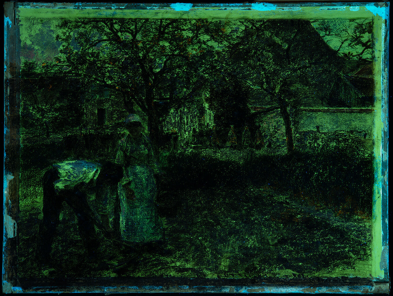 The ground layer is visible in the upper left and right corners of the composition. At upper right, the artist depicted a blue sky, but at upper left, the sky appears unfinished until viewed with the aid of ultraviolet radiation (Fig. 8). This brings out clouds, applied as patches of a white media that mildly absorb the ultraviolet radiation and appear darker than the surrounding ground, which fluoresces yellow. The lowest clouds have a mild pink fluorescence, possibly indicative of carmine.4No efforts, other than visual observation, were undertaken to identify the pigments and dyes used in the pastel media. Carmine is a red colorant derived from cochineal and kermes insects. It produces a vivid pink fluorescence when exposed to ultraviolet radiation. It is not lightfast and fades quickly under even the best exhibition standards. See Helmut Schweppe and Heinz Roosen-Runge, “Carmine–Cochineal Carmine and Kermes Carmine” in Artist’s Pigments: A Handbook of Their History and Characteristics, ed. Robert L. Feller (Washington, DC: National Gallery of Art, 1986), 1:255–83. This suggests that the clouds may have originally had a reddish glow at the time the pastel painting was executed, and raises the question of whether Lhermitte set the scene at sunrise or in the very early evening. Touches of carmine fluorescence can also be seen on the woman’s shoulder and head scarf. Perhaps they reflected the light of the sky? Finally, orange spots of ultraviolet-induced fluorescence are visible in the tree behind the potato garden. Today the pastel strokes in these areas are a dark yellow or colorless and look like leaves, but they may have originally indicated blooms.