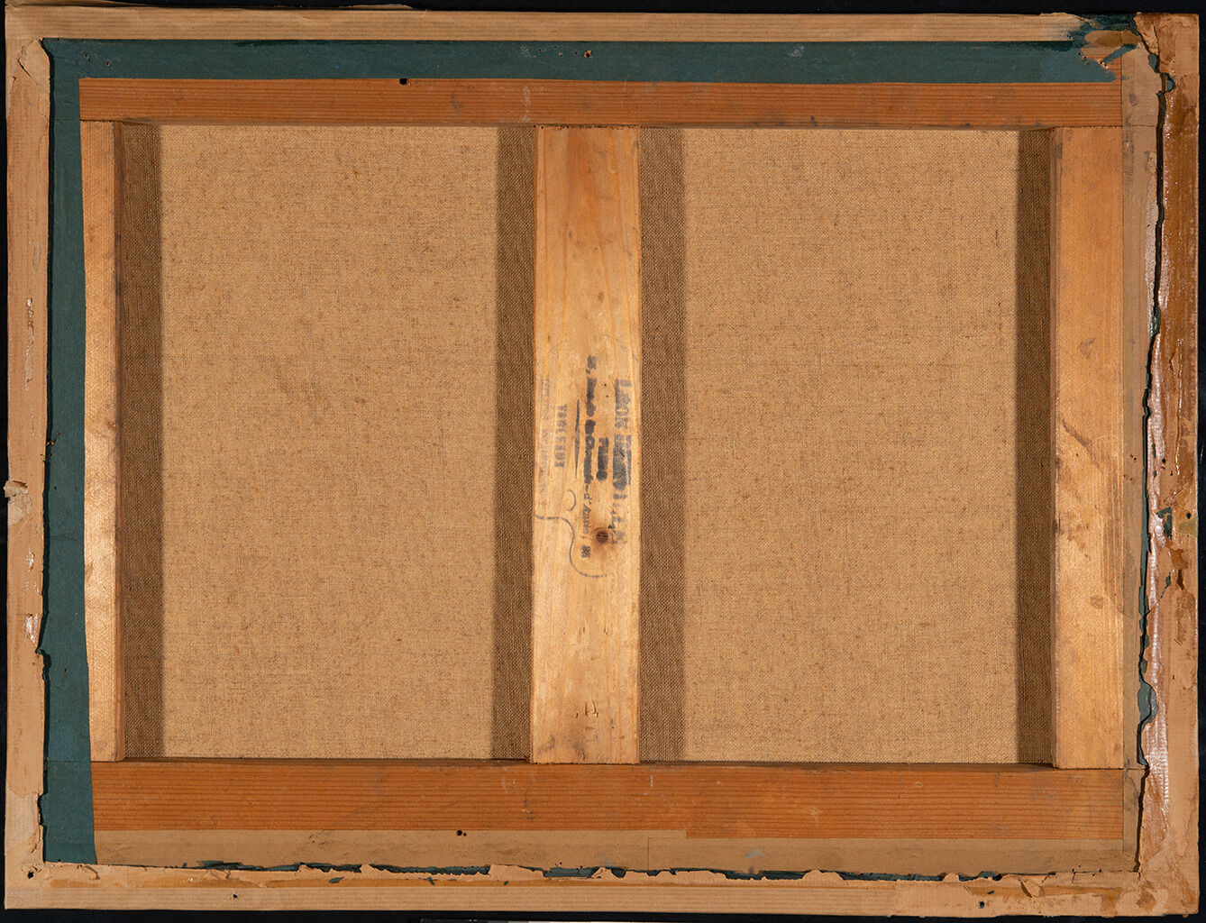 Other papers are visible along the edges, and these attest to previous matting campaigns. On all edges, and overlapping onto the back of the strainer and the wooden additions, is a blue paper that was commonly used as a dustcover during nineteenth-century framing campaigns (Fig. 9). A brown laid paper, probably another dust cover, is present along all edges and is peeling away from the upper edge (Fig. 7). Along the right edge is a thick, brown, recycled two-ply paperboard.3Paperboard refers to “stiff and thick ‘paper’ which may range from a ‘card’ of 0.20 mm or 1/125th of an inch or more and vary in composition from pure rag to wood, straw, and other substances having little or no affinity with ‘paper’ beyond the method of manufacture.” See E. J. Labarre, A Dictionary of Paper and Paper-making Terms (Amsterdam: N.V. Swets and Zeitlinger, 1937), 208–09. Hide gluehide glue: Also called animal skin glue, hide glue is an adhesive produced by boiling the skin, bones, tendons, and other connective tissues of animals to extract collagen proteins. was used as the main adhesive, and patches of the material, on the extreme borders of the artwork, were identified by the bright white ultraviolet (UV) induced visible fluorescence (Fig. 8).