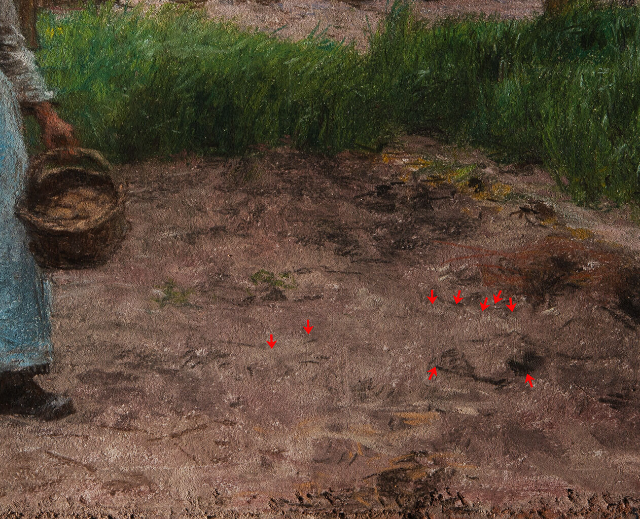Those powers of observation come into sharper focus when examining the Nelson-Atkins pastel, a medium the artist had only been using since 1885.6Le Pelley Fonteny, Léon Lhermitte (1844–1925). Lhermitte renders a couple planting potatoes on a small farm, possibly the Ru-Chailly, located across from the Marne from his studio, which served as the site for many of his compositions.7See Monique Le Pelley Fonteny, “Leon-Auguste Lhermitte, Sa Vie, Son Oeuvre: Catalogue des Peintures, Pastels, Dessins et Gravures” (PhD diss., Université Paris-Sorbonne, 1989), 37n9. Potato farming was hard work, and when done on a small scale, as seen in the pastel, it was not very profitable. In reality, potatoes were mass-cultivated in northern France from the 1850s. The cooler climate of Mont-Saint-Père, with its average two hundred days of rainfall per year, provides the perfect environment for potato farming. In fact, in France today, production of potatoes is concentrated largely in the Hauts-de-France region, which encompasses Mont-Saint-Père.8Jean-Pierre Goffart et al., “Potato Production in Northwestern Europe (Germany, France, the Netherlands, United Kingdom, Belgium): Characteristics, Issues, Challenges and Opportunities,” Potato Research (January 28, 2022): https://doi.org/10.1007/s11540-021-09535-8. See also Eloise Trenda, “The Potato Market in France: Statistics and Facts,” Statistica, October 1, 2021, https://www.statista.com/topics/8051/potato-market-france/#dossierKeyfigures.