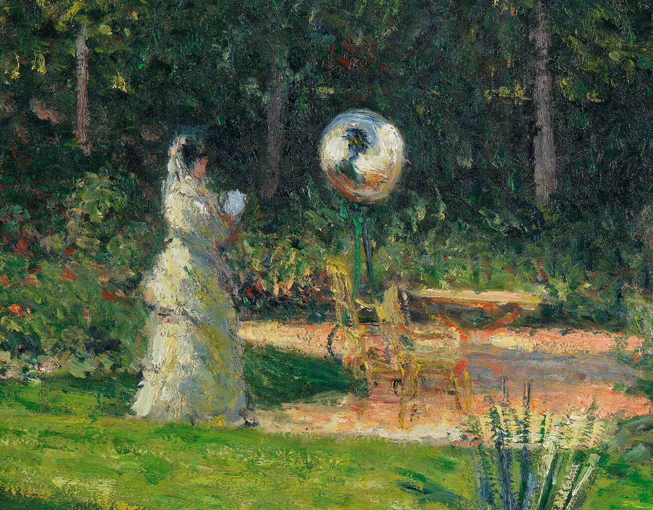 Deraismes’s and Pissarro’s artistic and ideological concerns can thus be seen as allied. Her writings highlighted, over and above the demand for explicit political rights, an improvement in women’s image and “representation,” in all social domains, including the theater and the arts.21Maria Deraismes, Ce que veulent les femmes: Articles et conférences de 1869 à 1891, ed. Odile Karkovitch (Paris: Syros, 1980). Knowing well the power of the visual to change the social, she fought her battle in and over the images of women. It is no surprise, then, that Deraismes is present within Pissarro’s painting of her garden—even mirrored within it—in a self-reflexive acknowledgment of the powers of representation. Pissarro found the most literal form of her feminist demands—a woman doubly represented as self and image in the fleeting yet meditative mirror-world of the gazing globe—perfectly in sync with the Impressionist program favoring all things that signaled depth beneath the surface.