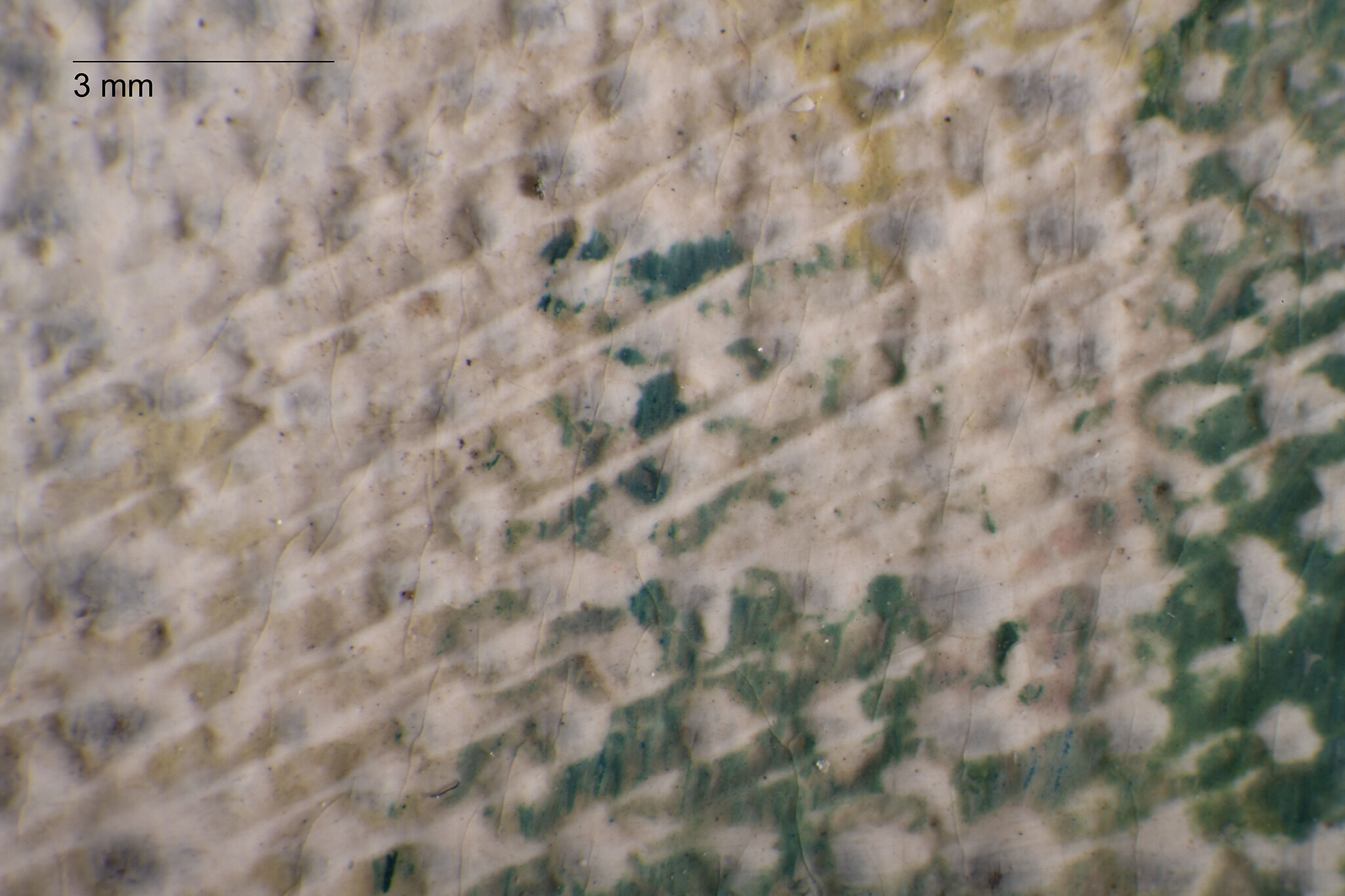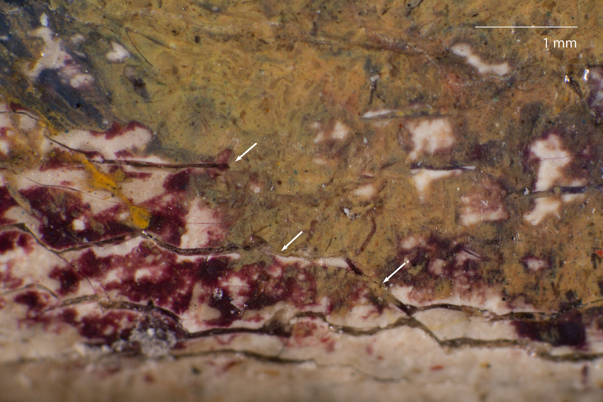 Fig. 12. Photomicrograph of the bottom edge, Study for “Young Girls Playing Volant” (ca. 1887), showing yellow-orange paint that covers cracks, located below the central figure’s shoulder