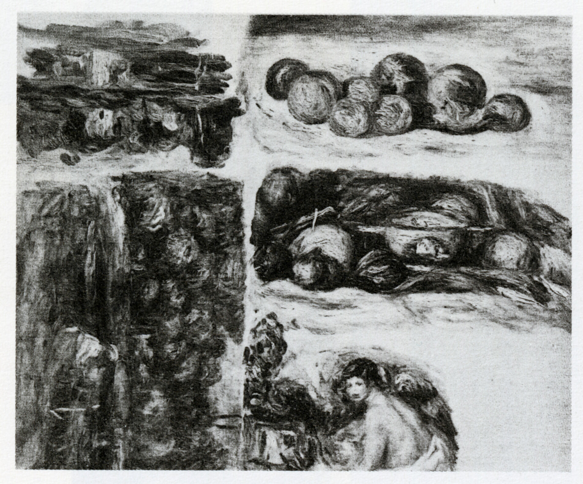 Fig. 9. Pierre-Auguste Renoir, Two Still Lifes, Two Landscapes, Nude, 1916, oil on canvas, 25 5/8 x 19 11/16 in. (65 × 50 cm), which was later cut and dispersed; photograph by Galerie Bernheim-Jeune, ca. 1920–22, published in Marc Elder and Albert André, L’Atelier de Renoir (Paris: Bernheim-Jeune, 1931), no. 576