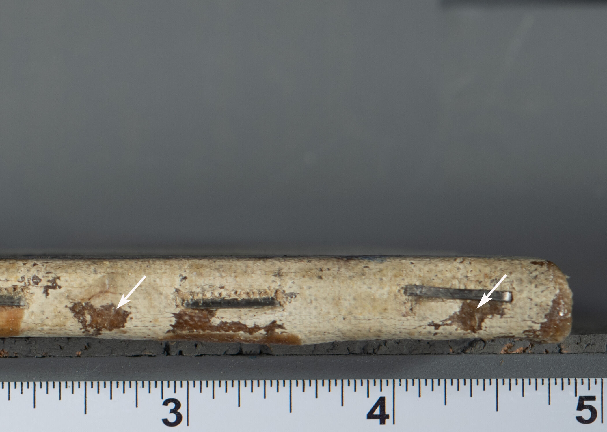 Fig. 10. Detail of the right side of the bottom tacking margin with arrows marking the locations of tack holes, Study for “Young Girls Playing Volant” (ca. 1887)