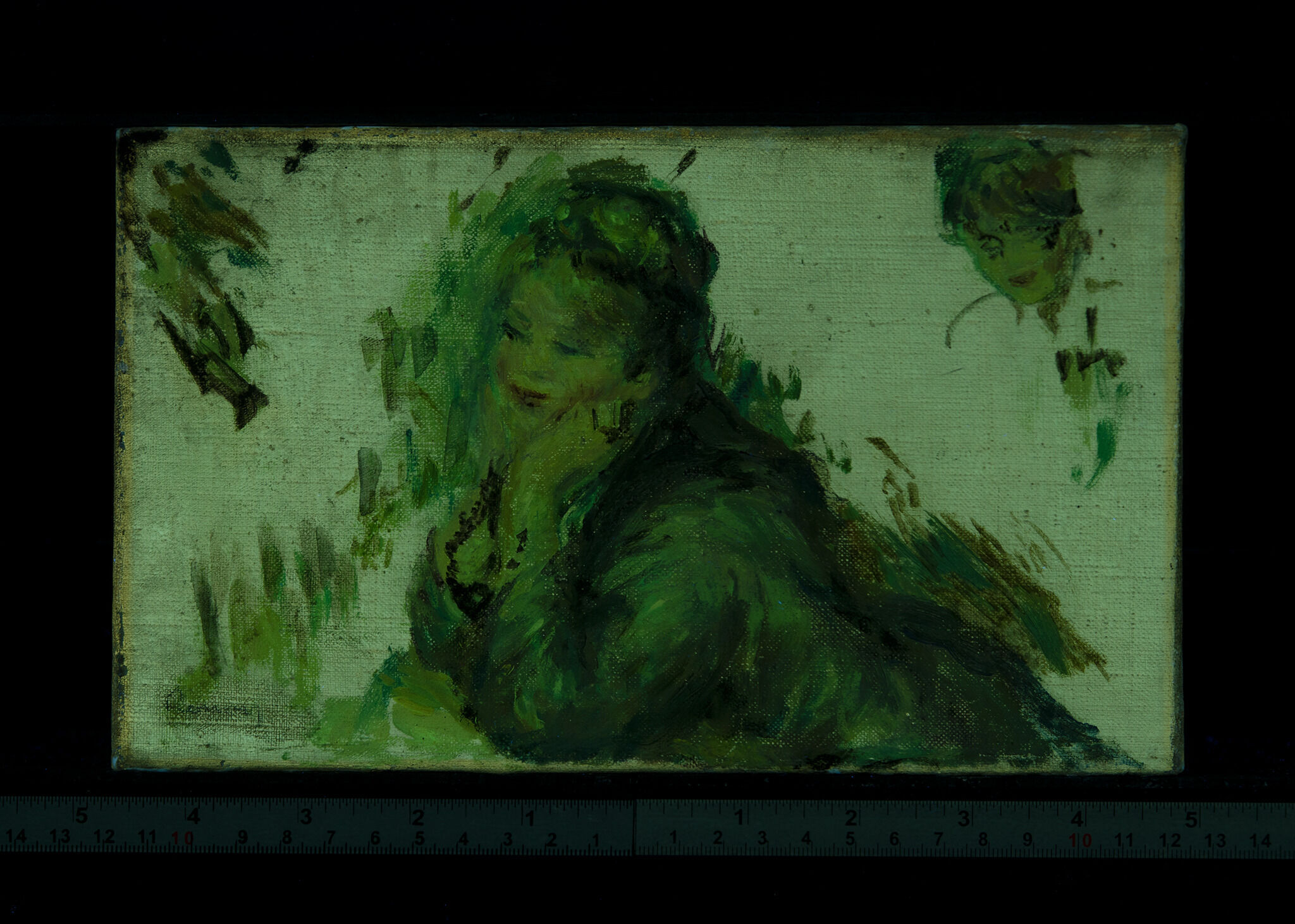 Fig. 13. Ultraviolet-induced visible fluorescence photograph, Study for “Young Girls Playing Volant” (ca. 1887)