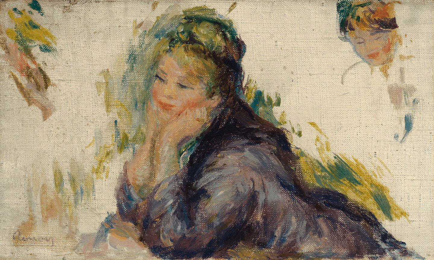 Throughout his career, Impressionist painter Pierre-Auguste Renoir (1841–1919) filled hundreds of small canvases with informal sketches of women, producing the majority of these works from the late 1890s until his death in 1919.1Renoir’s primary dealer, Paul Durand-Ruel, felt that these later sketches were harming Renoir’s reputation and in 1903 tackled the issue head on: “You are quite wrong to give away or to let people take from you all these sketches. We are determined to only exhibit your best paintings.” See Paul-Louis Durand-Ruel and Flavie Durand-Ruel, Paul Durand Ruel: Memoirs of the First Impressionist Art Dealer (1831–1922) (Paris: Flammarion, 2014), 213. Often left unfinished, such studies are considered a distinctive form of the artist’s pictorial expression. Albert André (1869–1954), an artist and close friend of Renoir’s later in his life, described Renoir’s fixation with sketches: “It is these sketches that he most loves; it’s in them that he expresses himself most fully, that he can be at his most audacious.” André went on to quote Renoir: “‘If I hadn’t been obliged to paint pictures to sell to a dealer and to make a living, I would have painted nothing except these.’”2Albert André, Renoir (Paris: Georges Crès et Cie, 1928), 49–50. With their sitters frequently seated in profile or depicted at half-length, these multifigural works disclose little information about the sitters’ identities or the settings. Indeed, the Nelson-Atkins sketch, formerly titled Woman Leaning on Her Elbows (Femme accoudée), was once associated with these works as a continued “exercise in rapid figural transcription.”3Richard R. Brettell, “Pierre-Auguste Renoir, Woman Leaning on Her Elbows (Femme accoudée),” in Richard R. Brettell, Manet to Matisse: Impressionist Masters from the Marion and Henry Bloch Collection, exh. cat. (Kansas City, MO: Nelson-Atkins Museum of Art, 2007), 92–93. Newly retitled Study for “Young Girls Playing Volant”, the work is now considered an exception to this pictorial anonymity. The sketch is now thought to be one of two preparatory studies (the other is Fig. 1) for Renoir’s painting Young Girls Playing Volant, formerly in the Minneapolis Institute of Art (Fig. 2).4Young Girls Playing Volant was formerly in the Minneapolis Institute of Art (1931–58) and most recently in the estate of collector Huguette Clark. See François Daulte, Auguste Renoir: Catalogue raisonné de l’œuvre peint, vol. 1, Figures, 1860–1890 (Lausanne: Éditions Durand-Ruel, 1971), no. 517, unpaginated. See also Impressionist and Modern Art Evening Sale, including property from the Estate of Edgar M. Bonfman, Christie’s, New York, May 6, 2014, lot 10. Study for “Young Girls Playing Volant” will be published as such by Wildenstein Plattner Institute in their upcoming catalogue raisonné of the artist’s work. See Impressionist and Modern Art Part Two, Sotheby’s, New York, November 3, 2005, lot 134.
