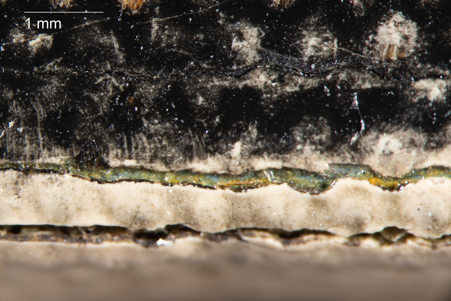 Fig. 10. Photomicrograph of a crack in the recto turnover edge revealing blue and yellow paint beneath a second ground layer, Seated Young Woman with an Amber Necklace (1942)